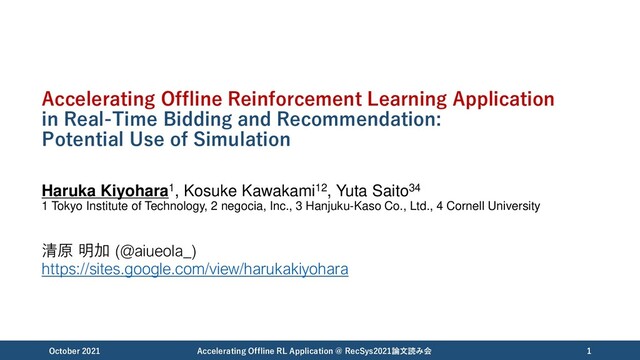 Offline Reinforcement Learning Application in Real-Time Bidding and Recommendation: Potential Use of Simulation Haruka Kiyohara1, Kosuke Kawakami12, Yuta Saito34 1 Tokyo Institute of Technology, 2 negocia, Inc., 3 Hanjuku-Kaso Co., Ltd., 4 Cornell University 清原 明加 (@aiueola_) https://sites.google.com/view/harukakiyohara 1