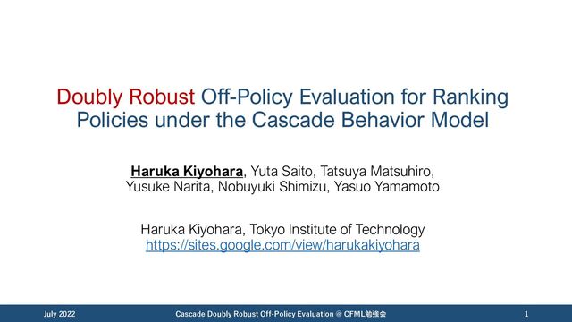 Satinder P. Singh. “Eligibility Traces for Off-Policy Policy Evaluation.” ICML, 2000. https://scholarworks.umass.edu/cgi/viewcontent.cgi?article=1079&context=cs_faculty_pubs [Strehl+, 10] Alex Strehl, John Langford, Sham Kakade, and Lihong Li. “Learning from Logged Implicit Exploration Data.” NeurIPS, 2010. https://arxiv.org/abs/1003.0120 [Li+, 18] Shuai Li, Yasin Abbasi-Yadkori, Branislav Kveton, S. Muthukrishnan, Vishwa Vinay, and Zheng Wen. “Offline Evaluation of Ranking Policies with Click Models.” KDD, 2018. https://arxiv.org/abs/1804.10488 [McInerney+, 20] James McInerney, Brian Brost, Praveen Chandar, Rishabh Mehrotra, and Ben Carterette. “Counterfactual Evaluation of Slate Recommendations with Sequential Reward Interactions.” KDD, 2020. https://arxiv.org/abs/2007.12986 [Dudík+, 14] Miroslav Dudík, Dumitru Erhan, John Langford, and Lihong Li. “Doubly Robust Policy Evaluation and Optimization.” ICML, 2011. https://arxiv.org/abs/1503.02834 [Jiang&Li, 16] Nan Jiang and Lihong Li. “Doubly Robust Off-policy Value Evaluation for Reinforcement Learning.” ICML, 2016. https://arxiv.org/abs/1511.03722 July 2022 Cascade Doubly Robust Off-Policy Evaluation @ CFML勉強会 87