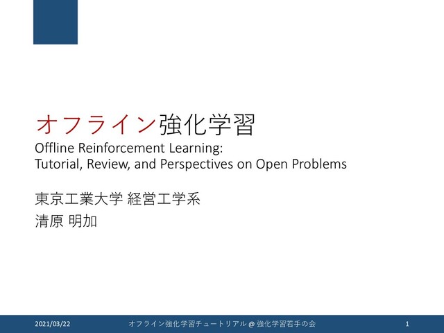 Novikov, Tom Le Paine, Sergio Gomez Colmenarejo, Konrad Zolna, Rishabh Agarwal, Josh Merel, Daniel Mankowitz, Cosmin Paduraru, Gabriel Dulac-Arnold, Jerry Li, Mohammad Norouzi, Matt Hoffman, Ofir Nachum, George Tucker, Nicolas Heess, and Nando de Freitas. “RL Unplugged: Benchmarks for Offline Reinforcement Learning”. arXiv preprint, 2020. https://arxiv.org/abs/2006.13888 [A. Kumar, 2019] A. Kumar. “Data-Driven Deep Reinforcement Learning”. BAIR blog, 2019. https://bair.berkeley.edu/blog/2019/12/05/bear/ [A. Kendall+, 2019] Alex Kendall, Jeffrey Hawke, David Janz, Przemyslaw Mazur, Daniele Reda, John-Mark Allen, Vinh-Dieu Lam, Alex Bewley, and Amar Shah. “Learning to Drive in a Day”. ICRA, 2019. https://arxiv.org/abs/1807.00412 [H. Zhu+, 2017] Han Zhu, Junqi Jin, Chang Tan, Fei Pan, Yifan Zeng, Han Li, and Kun Gai. “Optimized Cost per Click in Taobao Display Advertising”. KDD, 2017. https://arxiv.org/abs/1703.02091 [B. Zoph & Q. V. Le, 2016] Barret Zoph and Quoc V. Le. “Neural Architecture Search with Reinforcement Learning”. ICLR, 2016. https://arxiv.org/abs/1611.01578 2021/03/22 オフライン強化学習チュートリアル @ 強化学習若手の会 77