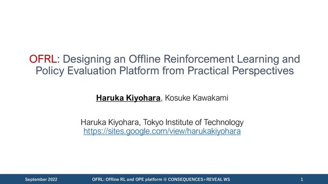 George Tucker, Ziyu Wang, Alexander Novikov, Mengjiao Yang, Michael R. Zhang, Yutian Chen, Aviral Kumar, Cosmin Paduraru, Sergey Levine, and Tom Le Paine. “Benchmarks for Deep Off-Policy Evaluation.” ICLR, 2021. https://arxiv.org/abs/2103.16596 [Voloshin+,21 (COBS)] Cameron Voloshin, Hoang M. Le, Nan Jiang, and Yisong Yue. “Empirical Study of Off-Policy Policy Evaluation for Reinforcement Learning.” NeurIPS dataset&benchmark, 2021. https://arxiv.org/abs/1911.06854 [Rohde+,18 (RecoGym)] David Rohde, Stephen Bonner, Travis Dunlop, Flavian Vasile, and Alexandros Karatzoglou “RecoGym: A Reinforcement Learning Environment for the problem of Product Recommendation in Online Advertising.” 2018. https://arxiv.org/abs/1808.00720 September 2022 OFRL: Offline RL and OPE platform @ CONSEQUENCES+REVEAL WS 47