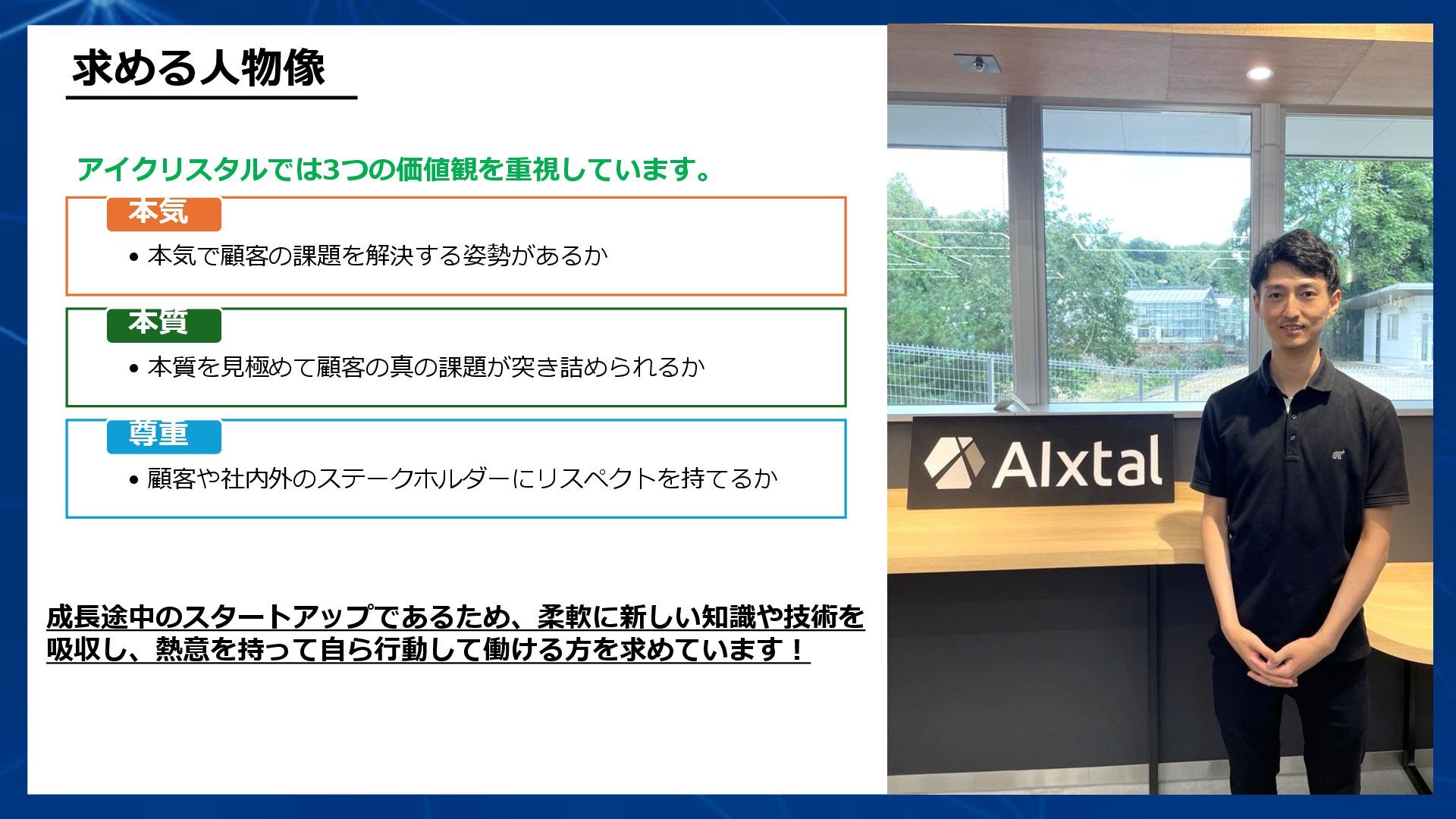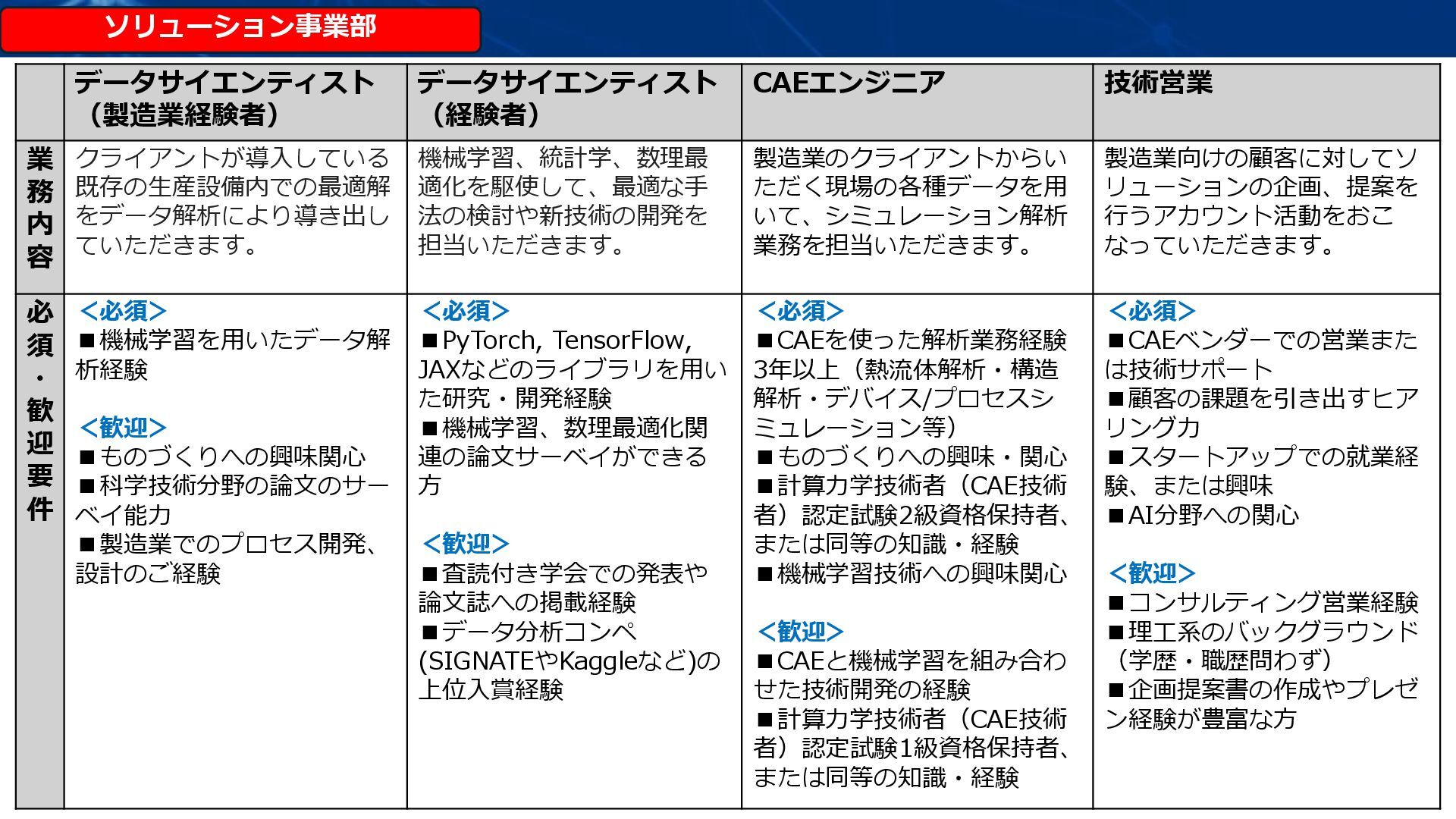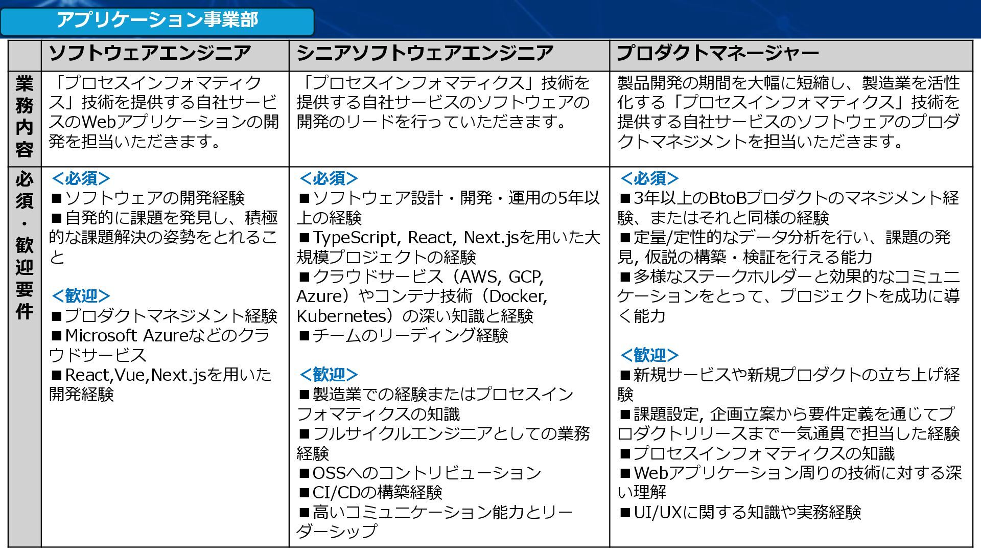 発を担当いただきます。 「プロセスインフォマティクス」技術を 提供する自社サービスのソフトウェアの 開発のリードを行っていただきます。 製品開発の期間を大幅に短縮し、製造業を活性 化する「プロセスインフォマティクス」技術を 提供する自社サービスのソフトウェアのプロダ クトマネジメントを担当いただきます。 必 須 ・ 歓 迎 要 件 <必須> ▪ソフトウェアの開発経験 ▪自発的に課題を発見し、積極 的な課題解決の姿勢をとれるこ と <歓迎> ▪プロダクトマネジメント経験 ▪Microsoft Azureなどのクラ ウドサービス ▪React,Vue,Next.jsを用いた 開発経験 <必須> ▪ソフトウェア設計・開発・運用の5年以 上の経験 ▪TypeScript, React, Next.jsを用いた大 規模プロジェクトの経験 ▪クラウドサービス(AWS, GCP, Azure)やコンテナ技術(Docker, Kubernetes)の深い知識と経験 ▪チームのリーディング経験 <歓迎> ▪製造業での経験またはプロセスイン フォマティクスの知識 ▪フルサイクルエンジニアとしての業務 経験 ▪OSSへのコントリビューション ▪CI/CDの構築経験 ▪高いコミュニケーション能力とリー ダーシップ <必須> ▪3年以上のBtoBプロダクトのマネジメント経 験、またはそれと同様の経験 ▪定量/定性的なデータ分析を行い、課題の発 見, 仮説の構築・検証を行える能力 ▪多様なステークホルダーと効果的なコミュニ ケーションをとって、プロジェクトを成功に導 く能力 <歓迎> ▪新規サービスや新規プロダクトの立ち上げ経 験 ▪課題設定, 企画立案から要件定義を通じてプ ロダクトリリースまで一気通貫で担当した経験 ▪プロセスインフォマティクスの知識 ▪Webアプリケーション周りの技術に対する深 い理解 ▪UI/UXに関する知識や実務経験 アプリケーション事業部