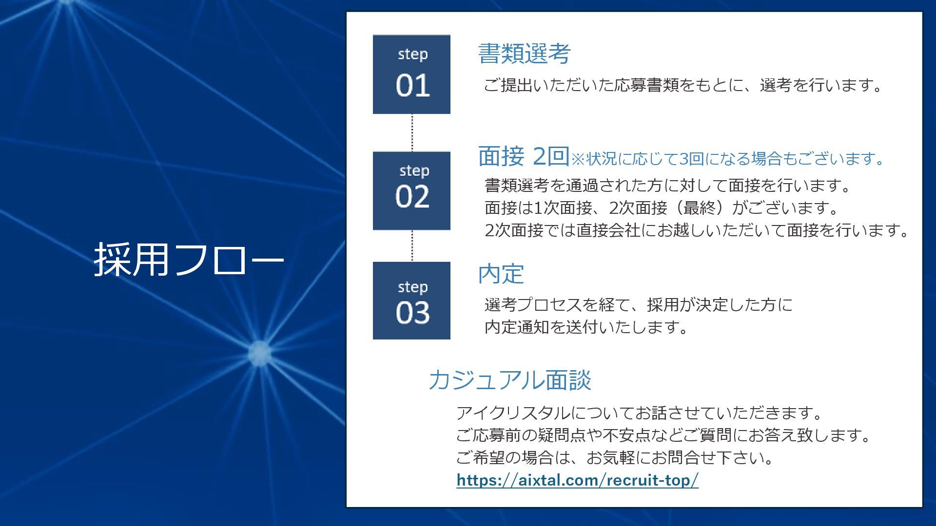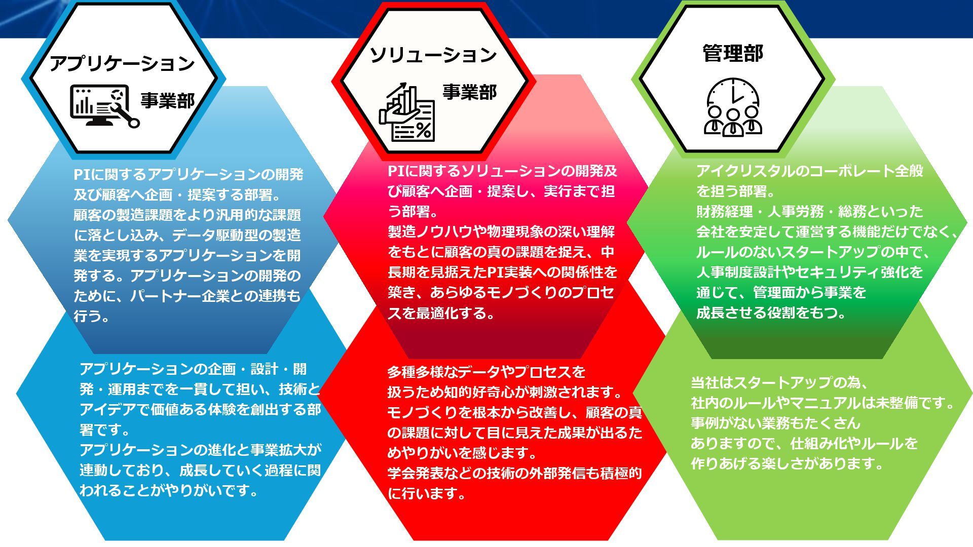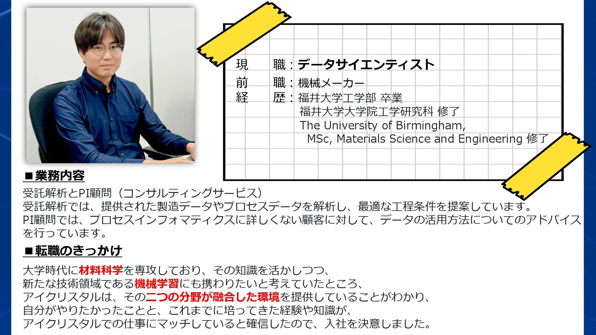 発を担当いただきます。 「プロセスインフォマティクス」技術を 提供する自社サービスのソフトウェアの 開発のリードを行っていただきます。 製品開発の期間を大幅に短縮し、製造業を活性 化する「プロセスインフォマティクス」技術を 提供する自社サービスのソフトウェアのプロダ クトマネジメントを担当いただきます。 必 須 ・ 歓 迎 要 件 <必須> ▪ソフトウェアの開発経験 ▪自発的に課題を発見し、積極 的な課題解決の姿勢をとれるこ と <歓迎> ▪プロダクトマネジメント経験 ▪Microsoft Azureなどのクラ ウドサービス ▪React,Vue,Next.jsを用いた 開発経験 <必須> ▪ソフトウェア設計・開発・運用の5年以 上の経験 ▪TypeScript, React, Next.jsを用いた大 規模プロジェクトの経験 ▪クラウドサービス(AWS, GCP, Azure)やコンテナ技術(Docker, Kubernetes)の深い知識と経験 ▪チームのリーディング経験 <歓迎> ▪製造業での経験またはプロセスイン フォマティクスの知識 ▪フルサイクルエンジニアとしての業務 経験 ▪OSSへのコントリビューション ▪CI/CDの構築経験 ▪高いコミュニケーション能力とリー ダーシップ <必須> ▪3年以上のBtoBプロダクトのマネジメント経 験、またはそれと同様の経験 ▪定量/定性的なデータ分析を行い、課題の発 見, 仮説の構築・検証を行える能力 ▪多様なステークホルダーと効果的なコミュニ ケーションをとって、プロジェクトを成功に導 く能力 <歓迎> ▪新規サービスや新規プロダクトの立ち上げ経 験 ▪課題設定, 企画立案から要件定義を通じてプ ロダクトリリースまで一気通貫で担当した経験 ▪プロセスインフォマティクスの知識 ▪Webアプリケーション周りの技術に対する深 い理解 ▪UI/UXに関する知識や実務経験 アプリケーション事業部