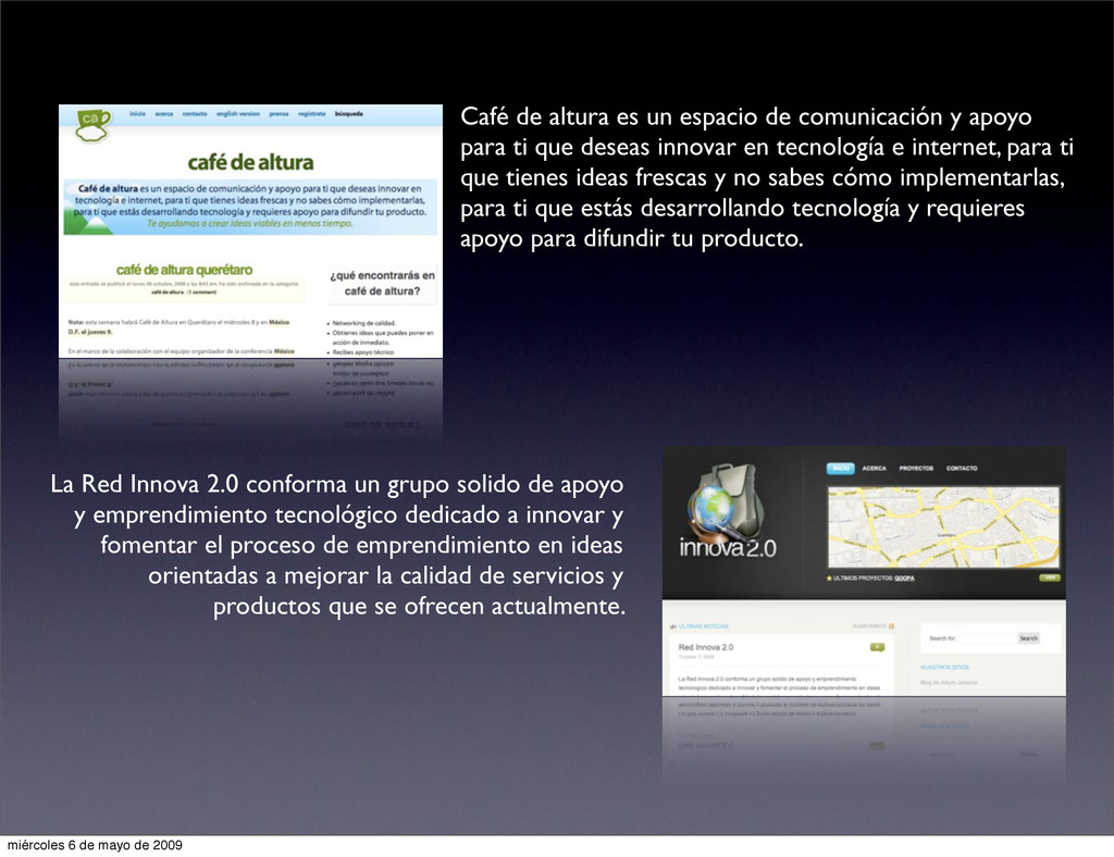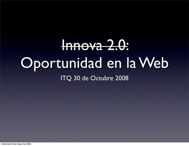 para ti que deseas innovar en tecnología e internet, para ti que tienes ideas frescas y no sabes cómo implementarlas, para ti que estás desarrollando tecnología y requieres apoyo para difundir tu producto. La Red Innova 2.0 conforma un grupo solido de apoyo y emprendimiento tecnológico dedicado a innovar y fomentar el proceso de emprendimiento en ideas orientadas a mejorar la calidad de servicios y productos que se ofrecen actualmente. miércoles 6 de mayo de 2009
