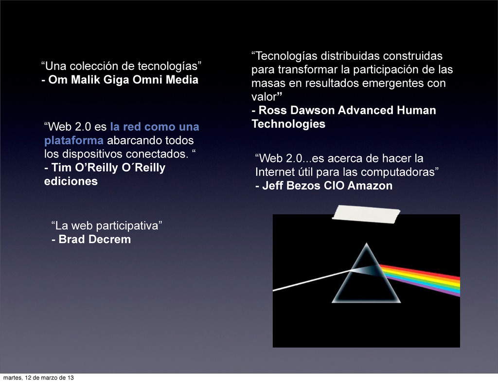 “Tecnologías distribuidas construidas para transformar la participación de las masas en resultados emergentes con valor” - Ross Dawson Advanced Human Technologies “Web 2.0 es la red como una plataforma abarcando todos los dispositivos conectados. “ - Tim O’Reilly O´Reilly ediciones “Web 2.0...es acerca de hacer la Internet útil para las computadoras” - Jeff Bezos CIO Amazon martes, 12 de marzo de 13