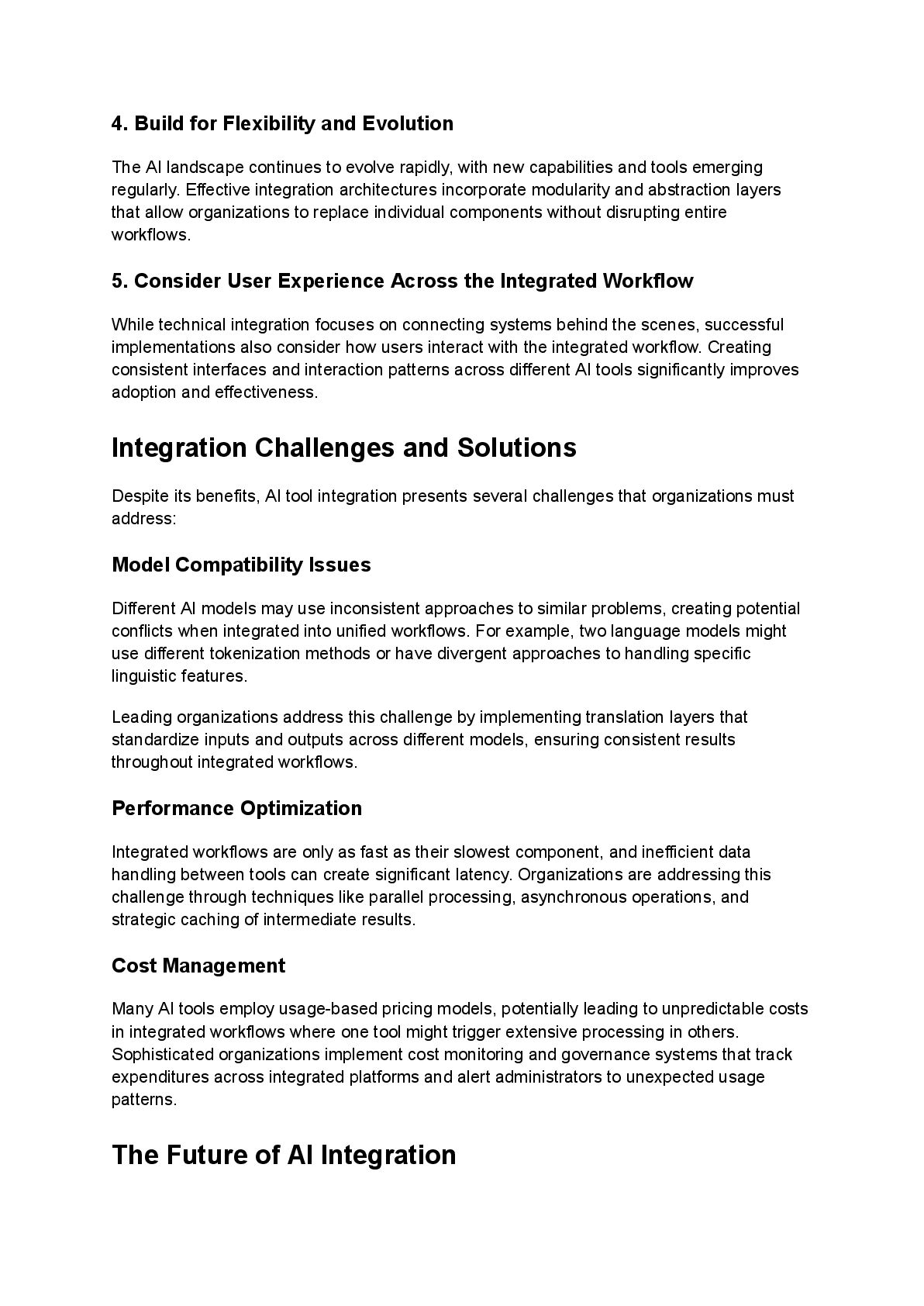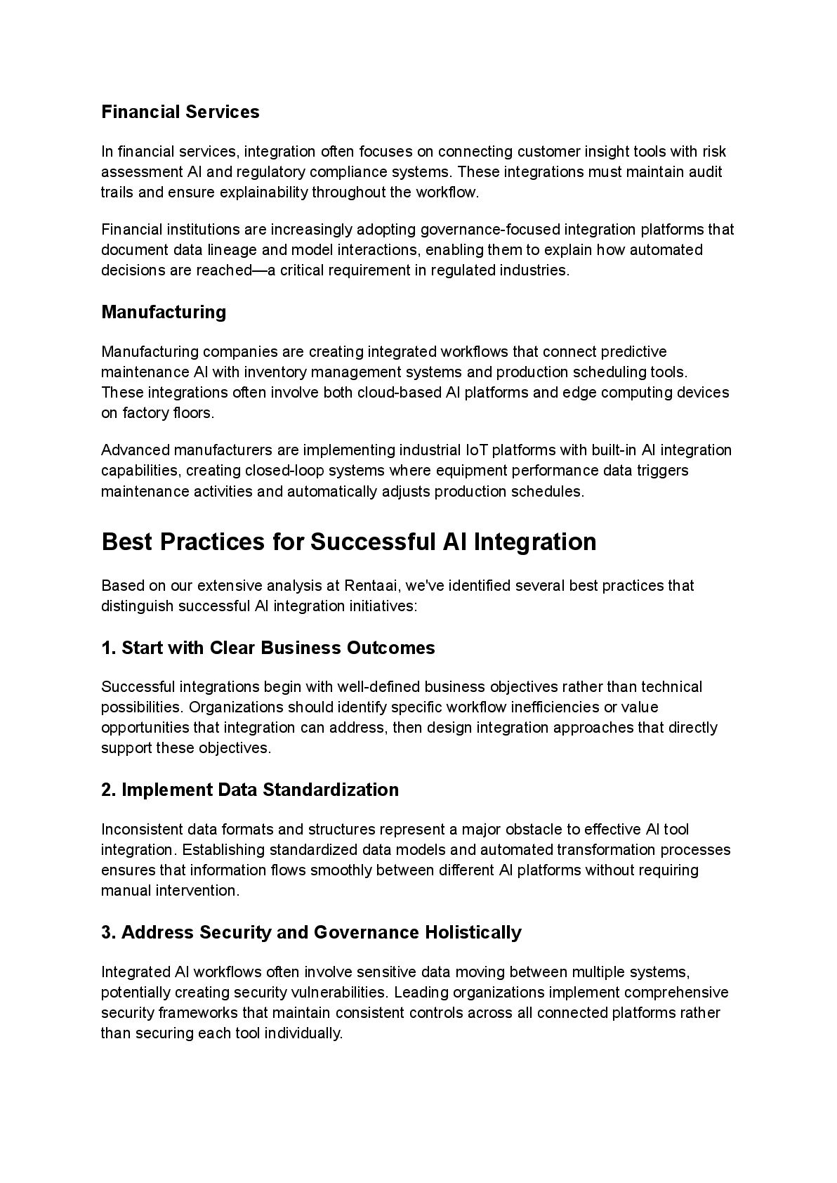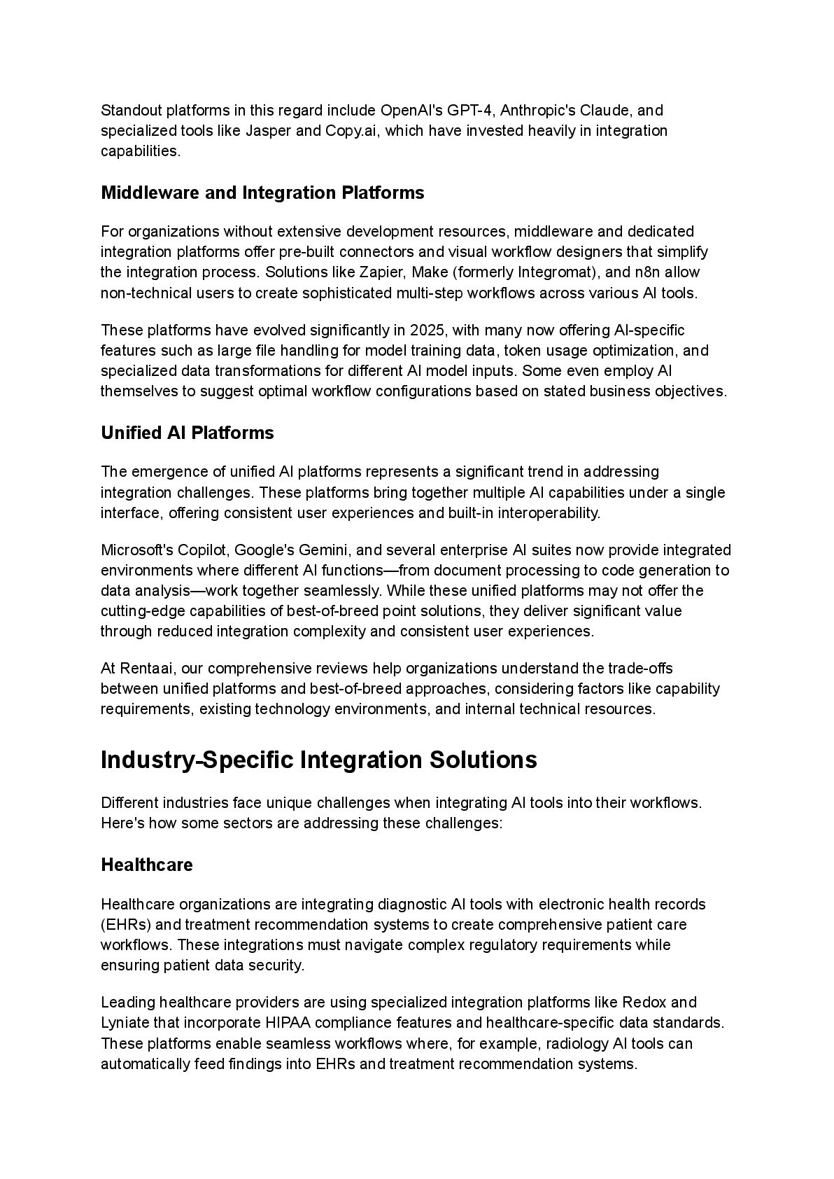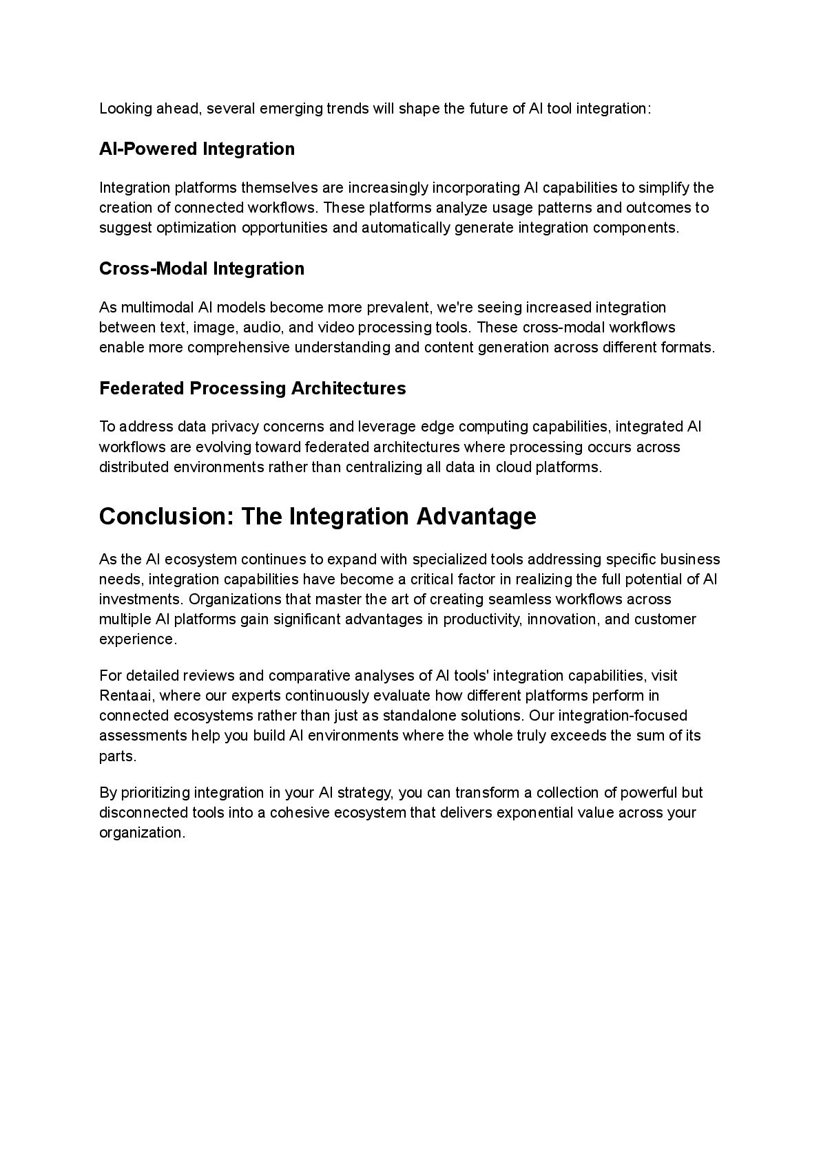 This comprehensive guide explores how organizations can maximize their AI investments by effectively integrating multiple specialized tools into cohesive workflows. Discover key integration approaches—from API-first solutions to middleware platforms—along with industry-specific examples, best practices, and common challenges. Learn how successful integration can eliminate data silos, reduce platform-switching time, and deliver up to 34% higher productivity gains compared to using the same tools in isolation. Visit Rentaai for detailed reviews on AI tools with superior integration capabilities to build an ecosystem where the whole exceeds the sum of its parts.
