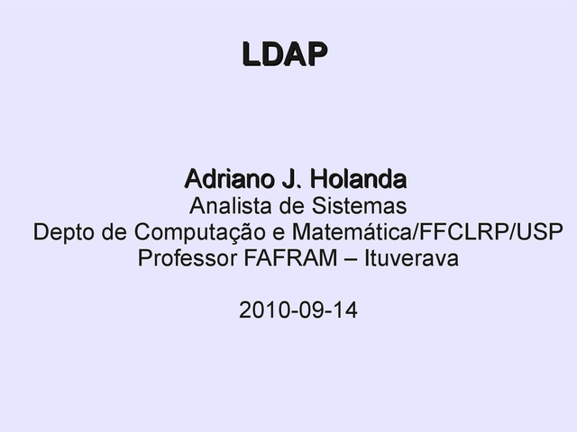 de recursos de rede para sistemas Windows ou baseados em Unix; • LDAP é a base do Active Directory que substitui a rede Windows (SMB – Server Message Block); • Possui ampla quantidade de programas com interface de comunicação LDAP: apache, postfix, samba, qmail, courier,...; • E também APIs: C, Perl, Java, .Net, PHP, … .