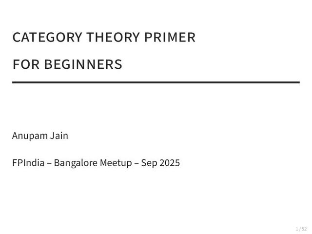 of a category. • Objects: All sets. (e.g., {1,2,3}, R, {cat,dog}) • Morphisms: All functions between sets. • Composition: Standard function composition. • Identity: The identity function for each set, idA (x) = x. 42 / 52