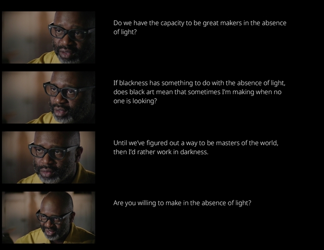 the absence of light? If blackness has something to do with the absence of light, does black art mean that sometimes I’m making when no one is looking? Until we’ve figured out a way to be masters of the world, then I’d rather work in darkness. Are you willing to make in the absence of light?