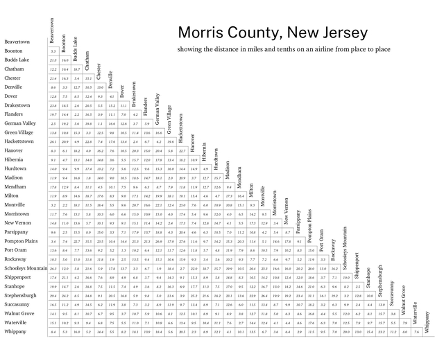 tenths on an airline from place to place Beavertown Boonton Budds Lake Chatham Chester Denville Dover Drakestown Flanders German Valley Green Village Hackettstown Hanover Hibernia Hurdtown Madison Mendham Milton Montville Morristown New Vernon Parsippany Pompton Plains Port Oram Rockaway Schooleys Mountain Shippenport Stanhope Stephensburgh Succasunny Walnut Grove Waterville Whippany Beavertown Boonton 5.3 Budds Lake 21.3 16.0 Chatham 12.2 10.4 18.7 Chester 21.4 16.3 5.4 15.1 Denville 8.6 3.3 12.7 10.5 13.0 Dover 12.8 7.5 8.5 12.4 9.3 4.1 Drakestown 23.8 18.5 2.6 20.5 5.5 15.2 11.1 Flanders 19.7 14.4 2.2 16.5 3.9 11.1 7.0 4.2 German Valley 2.5 19.2 5.6 19.8 1.1 16.6 12.6 3.7 5.9 Green Village 13.8 10.8 15.3 3.3 12.5 9.8 10.5 11.4 13.6 16.6 Hackettstown 26.1 20.9 4.9 22.8 7.4 17.6 13.4 2.4 6.7 4.2 19.6 Hanover 8.3 6.1 18.2 4.0 16.2 7.6 10.5 20.3 15.0 20.4 5.8 22.7 Hibernia 9.1 4.7 13.1 14.0 14.8 3.6 5.5 15.7 12.0 17.8 13.4 18.2 10.9 Hurdtown 14.0 9.4 9.9 17.4 13.2 7.2 5.6 12.5 9.6 15.3 16.0 14.4 14.9 4.9 Madison 11.9 9.4 16.8 1.8 14.0 9.0 10.5 18.6 14.7 18.1 2.0 20.9 3.7 12.7 15.7 Mendham 17.8 12.9 8.4 11.1 4.5 10.1 7.5 9.6 6.3 8.7 7.9 11.8 11.9 12.7 12.6 9.4 Milton 11.9 8.9 14.6 18.7 17.6 8.3 9.0 17.1 14.2 19.9 18.1 19.1 15.4 4.6 4.7 17.3 16.4 Montville 3.2 2.2 18.1 11.5 18.4 5.5 9.6 20.7 16.6 22.1 12.4 23.0 7.6 6.0 10.9 10.8 15.1 9.3 Morristown 11.7 7.6 13.1 5.8 10.3 6.0 6.6 15.0 10.9 15.0 4.0 17.4 5.4 9.6 12.0 4.0 6.5 14.2 9.5 New Vernon 14.8 11.0 13.6 5.7 10.1 9.3 9.1 15.1 11.4 14.2 2.4 17.3 7.4 12.8 14.7 4.1 5.5 17.3 12.9 3.4 Parsippany 9.6 2.5 15.5 8.0 15.0 3.3 7.1 17.9 13.7 18.8 4.3 20.4 4.6 6.3 10.5 7.0 11.2 10.8 4.2 5.4 8.7 Pompton Plains 3.4 7.4 22.7 15.5 23.5 10.4 14.4 25.3 21.3 26.9 17.0 27.6 11.6 9.7 14.2 15.3 20.3 11.4 5.1 14.6 17.8 9.1 Port Oram 13.6 8.4 7.7 13.6 9.2 5.2 1.3 10.2 6.4 12.1 11.7 12.6 11.8 5.7 4.8 11.9 7.9 8.6 10.5 7.9 10.2 8.3 15.0 Rockaway 10.3 5.0 11.0 11.8 11.8 1.9 2.5 13.5 9.4 15.1 10.6 15.9 9.3 3.4 5.6 10.2 9.3 7.7 7.2 6.6 9.7 5.2 11.9 3.3 Schooleys Mountain 26.3 12.0 5.8 21.6 5.9 17.8 13.7 3.3 6.7 1.9 18.4 2.7 22.0 18.7 15.7 19.9 10.5 20.4 23.3 16.6 16.0 20.2 28.0 13.0 16.2 Shippenport 17.4 21.1 4.2 16.6 7.6 8.9 4.9 6.8 3.7 9.4 14.3 9.1 15.3 8.9 5.8 14.8 8.3 10.5 14.2 10.8 12.4 12.0 18.6 3.7 7.1 10.0 Stanhope 19.9 14.7 2.6 18.8 7.5 11.5 7.4 4.9 3.6 8.2 16.3 6.9 17.7 11.3 7.5 17.0 9.5 12.2 16.7 13.0 14.2 14.6 21.0 6.3 9.6 8.2 2.5 Stephensburgh 29.4 24.2 8.5 24.8 9.1 20.5 16.8 5.9 9.8 5.0 21.6 3.9 25.2 21.6 18.2 23.1 13.6 22.9 26.4 19.9 19.2 23.4 31.1 16.1 19.2 3.2 12.8 10.8 Succasunny 16.5 11.2 4.9 14.5 6.2 11.9 3.8 7.3 3.2 8.9 11.9 9.7 13.4 8.9 7.1 12.6 6.0 11.5 13.4 8.7 9.9 10.7 18.2 3.2 6.3 9.9 2.4 4.4 13.0 Walnut Grove 14.1 9.5 8.1 10.7 6.7 9.5 3.7 10.7 5.9 10.6 8.1 12.5 10.1 8.9 9.1 8.9 3.8 12.7 11.8 5.0 6.3 8.6 16.8 4.4 5.5 12.0 6.2 8.1 15.7 3.8 Waterville 15.1 10.2 9.3 9.4 6.8 7.5 5.5 11.0 7.1 10.9 6.6 13.4 9.5 10.4 11.1 7.6 2.7 14.4 12.4 4.1 4.4 8.6 17.6 6.3 7.0 12.5 7.9 9.7 15.7 5.5 7.9 Whippany 8.4 5.3 16.0 5.2 14.4 5.5 8.2 18.1 13.9 18.4 5.6 20.5 2.3 8.9 12.1 4.1 10.1 13.5 6.7 3.6 6.4 2.9 11.5 9.5 7.0 20.0 13.0 15.4 23.2 11.2 8.0 7.6