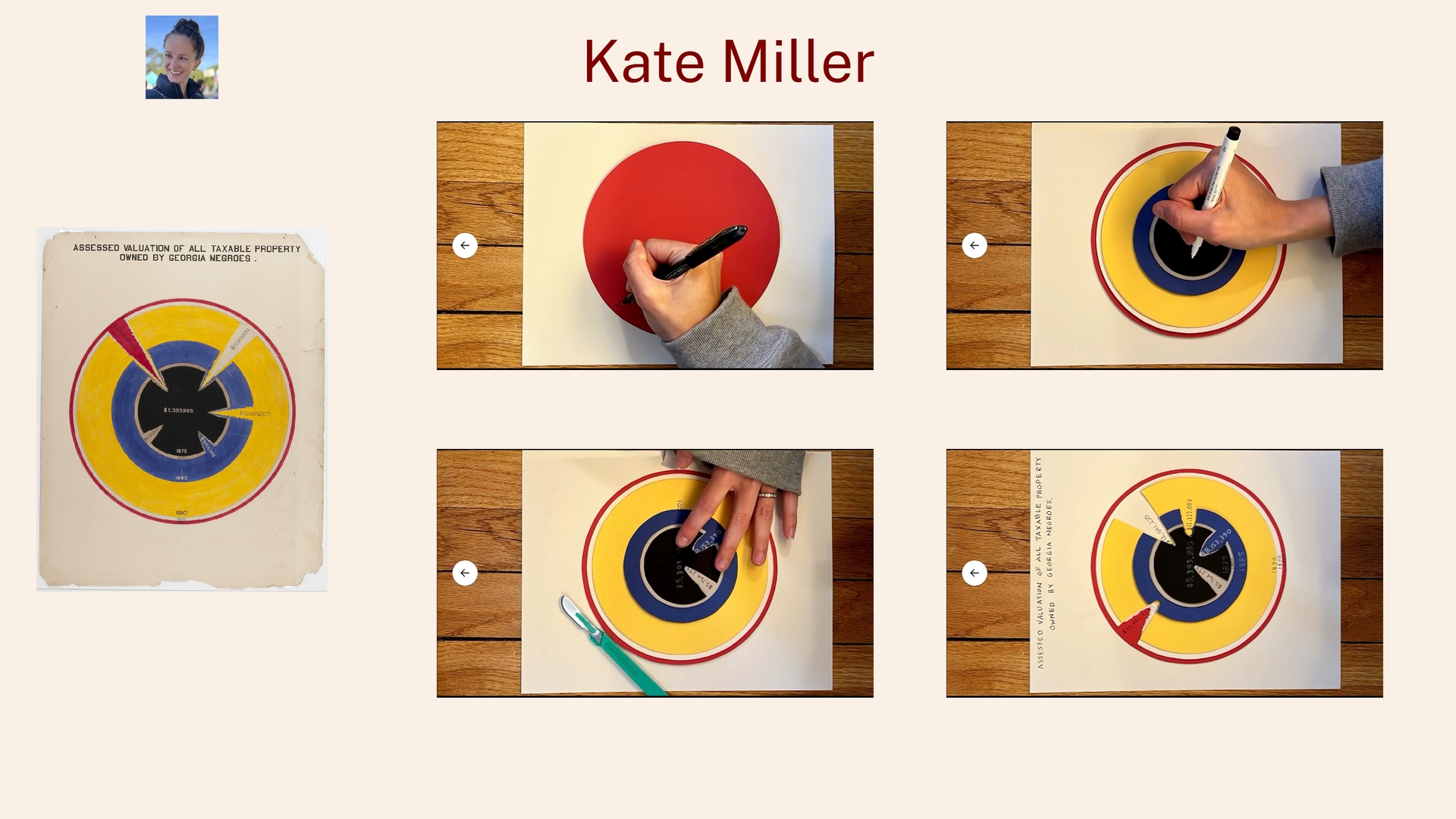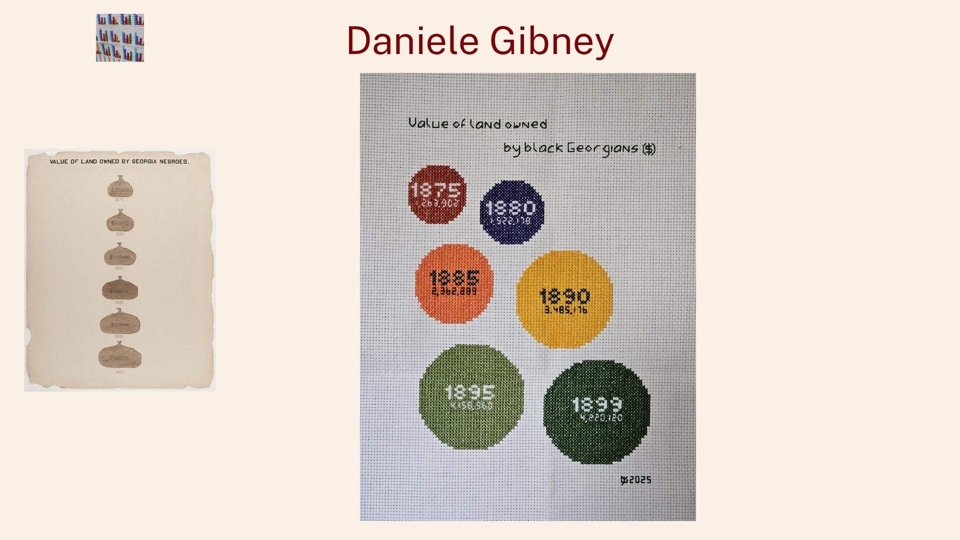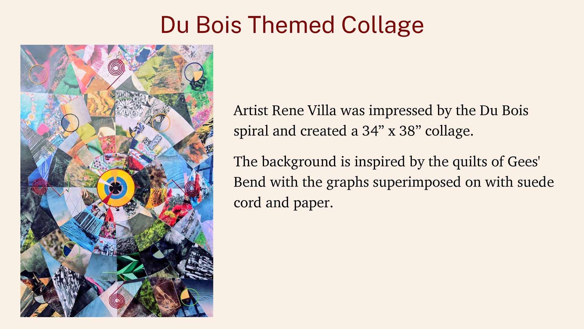 the Du Bois spiral and created a 34” x 38” collage. The background is inspired by the quilts of Gees' Bend with the graphs superimposed on with suede cord and paper.