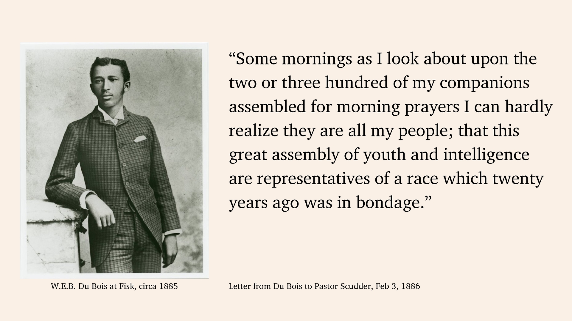 three hundred of my companions assembled for morning prayers I can hardly realize they are all my people; that this great assembly of youth and intelligence are representatives of a race which twenty years ago was in bondage.” Letter from Du Bois to Pastor Scudder, Feb 3, 1886 W.E.B. Du Bois at Fisk, circa 1885