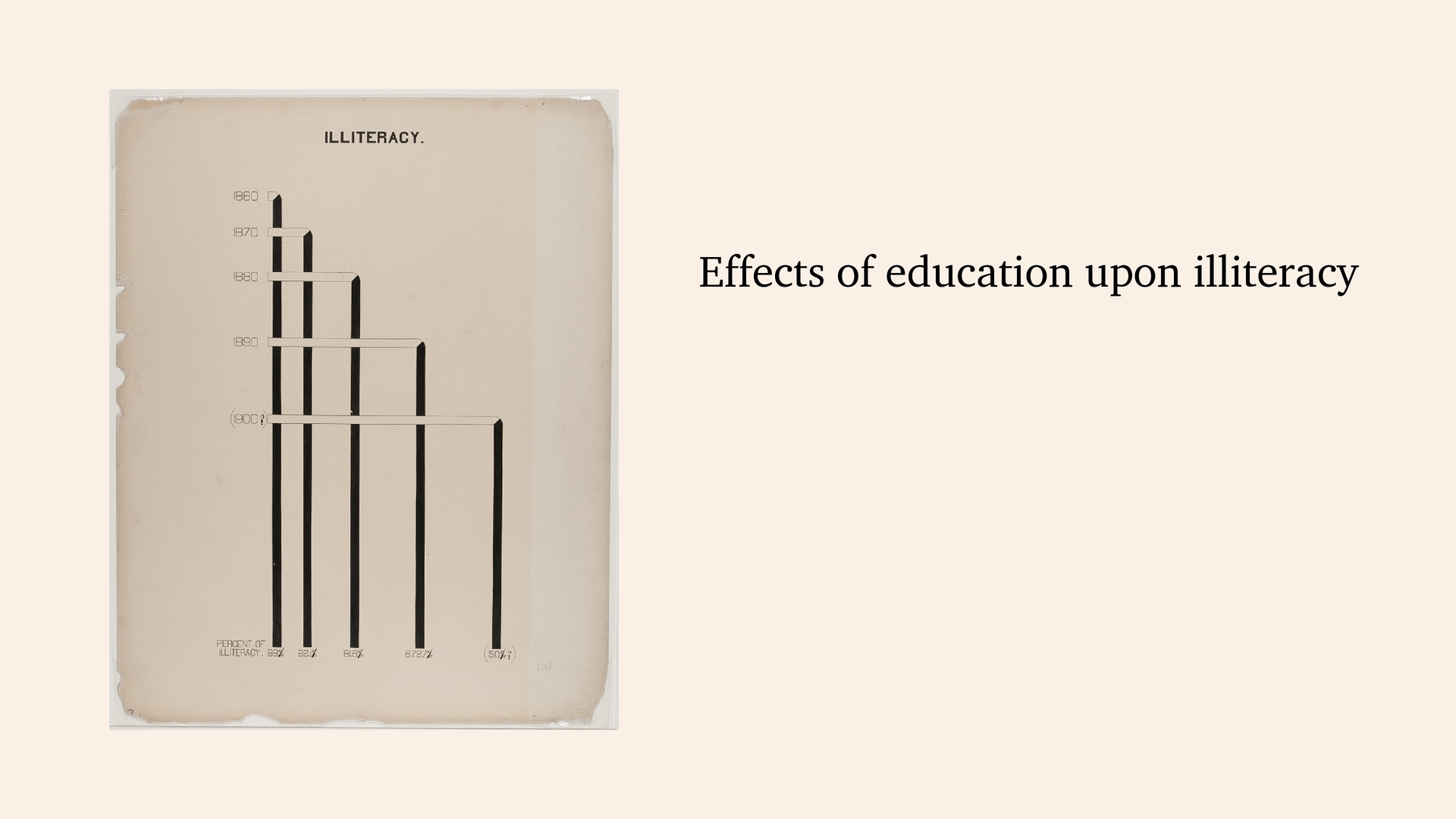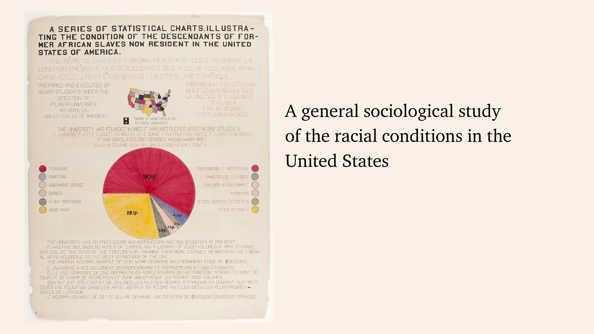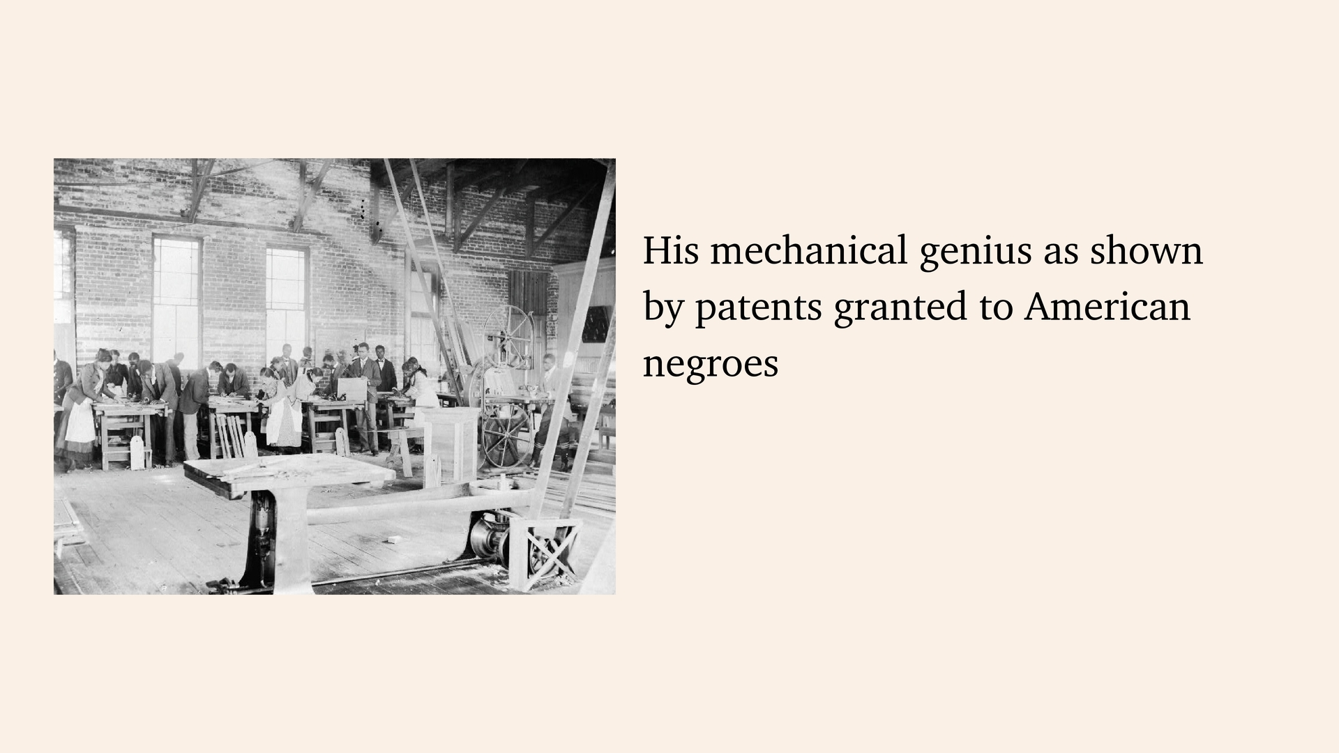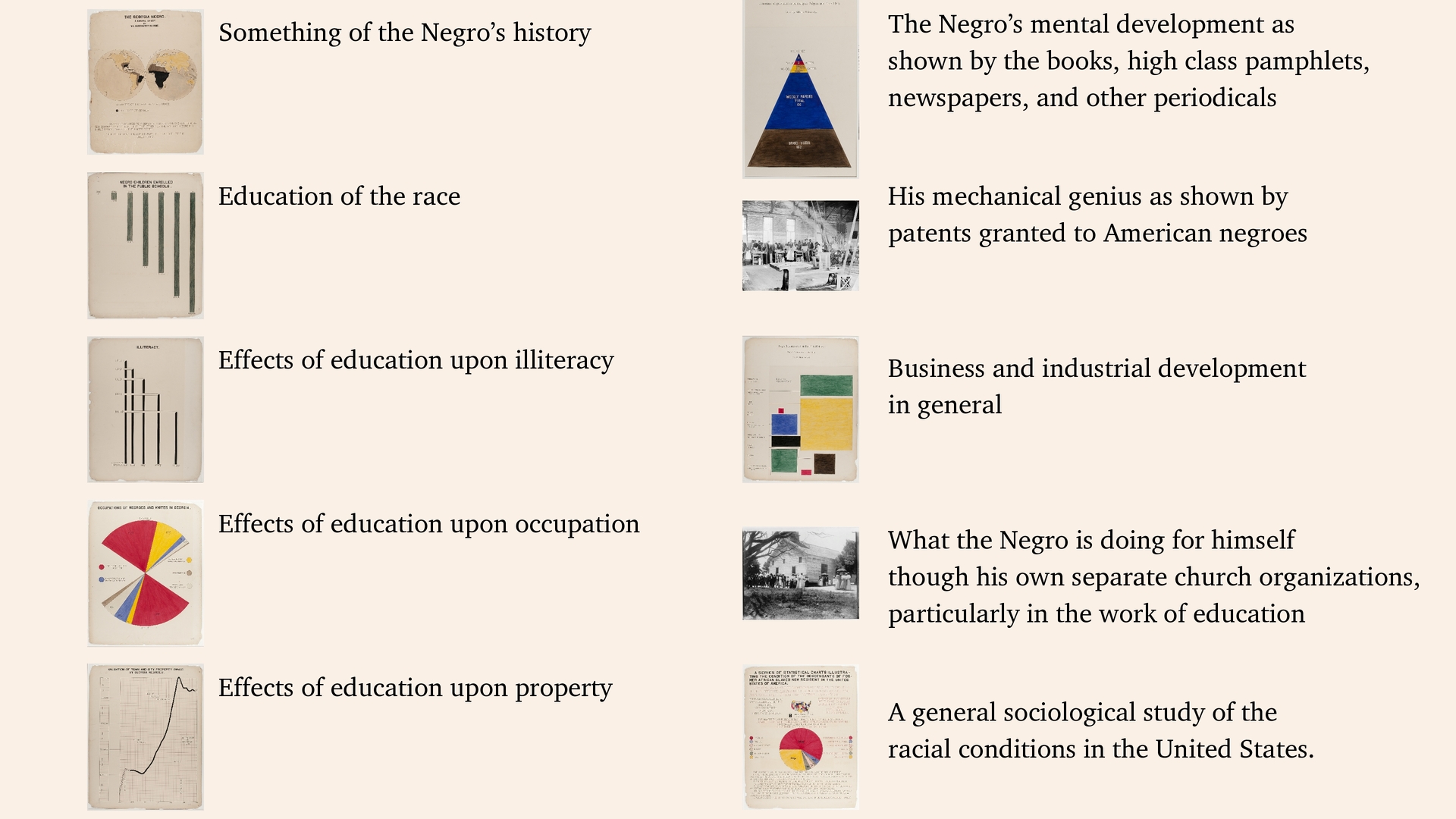 of education upon illiteracy Effects of education upon occupation Effects of education upon property The Negro’s mental development as shown by the books, high class pamphlets, newspapers, and other periodicals His mechanical genius as shown by patents granted to American negroes Business and industrial development in general What the Negro is doing for himself though his own separate church organizations, particularly in the work of education A general sociological study of the racial conditions in the United States.