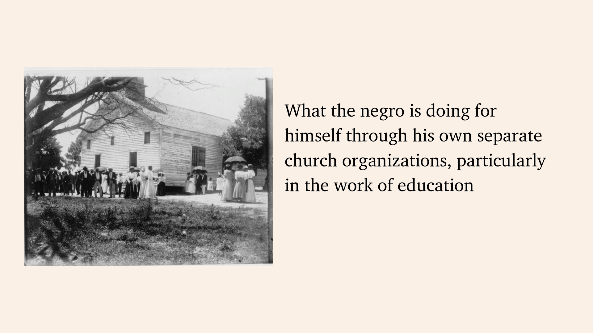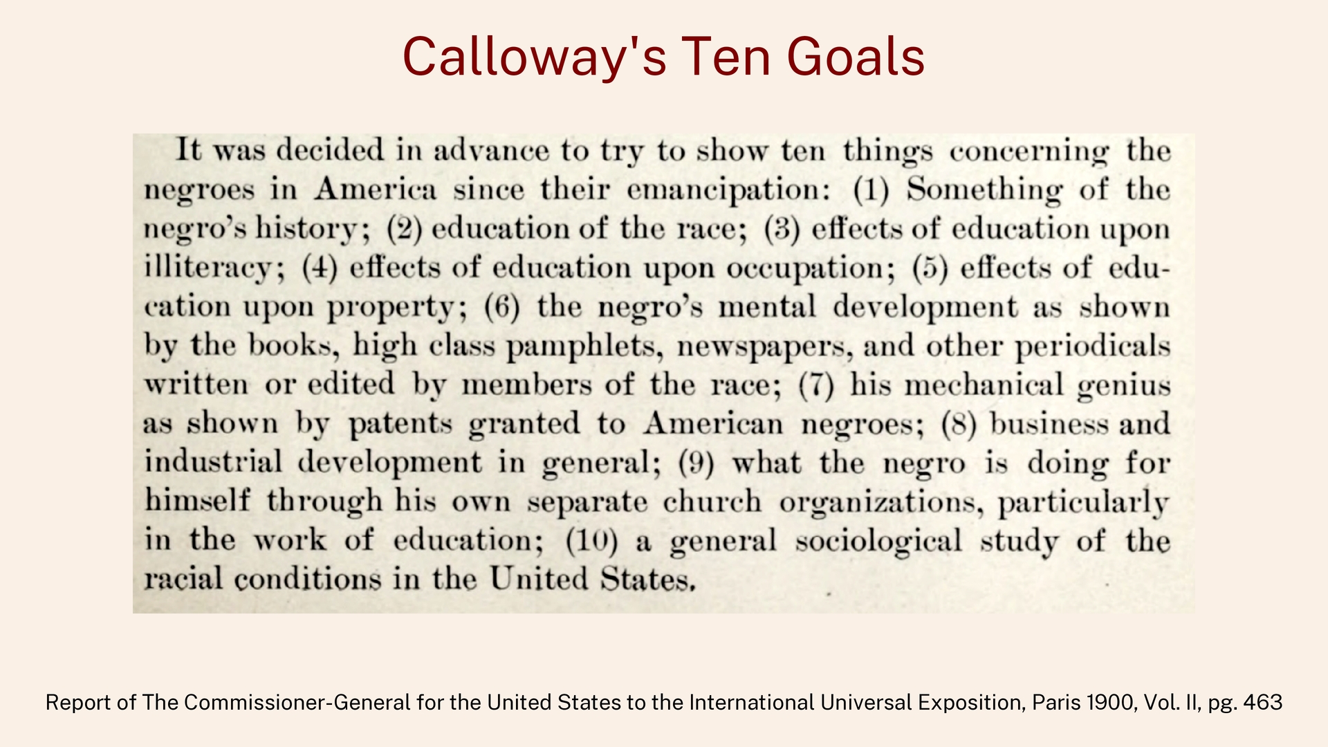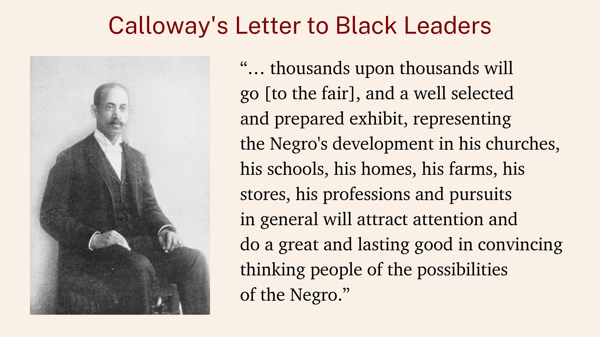 go [to the fair], and a well selected and prepared exhibit, representing the Negro's development in his churches, his schools, his homes, his farms, his stores, his professions and pursuits in general will attract attention and do a great and lasting good in convincing thinking people of the possibilities of the Negro.”