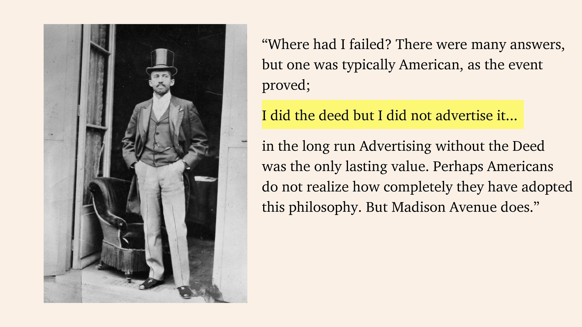 was typically American, as the event proved; I did the deed but I did not advertise it... in the long run Advertising without the Deed was the only lasting value. Perhaps Americans do not realize how completely they have adopted this philosophy. But Madison Avenue does.”