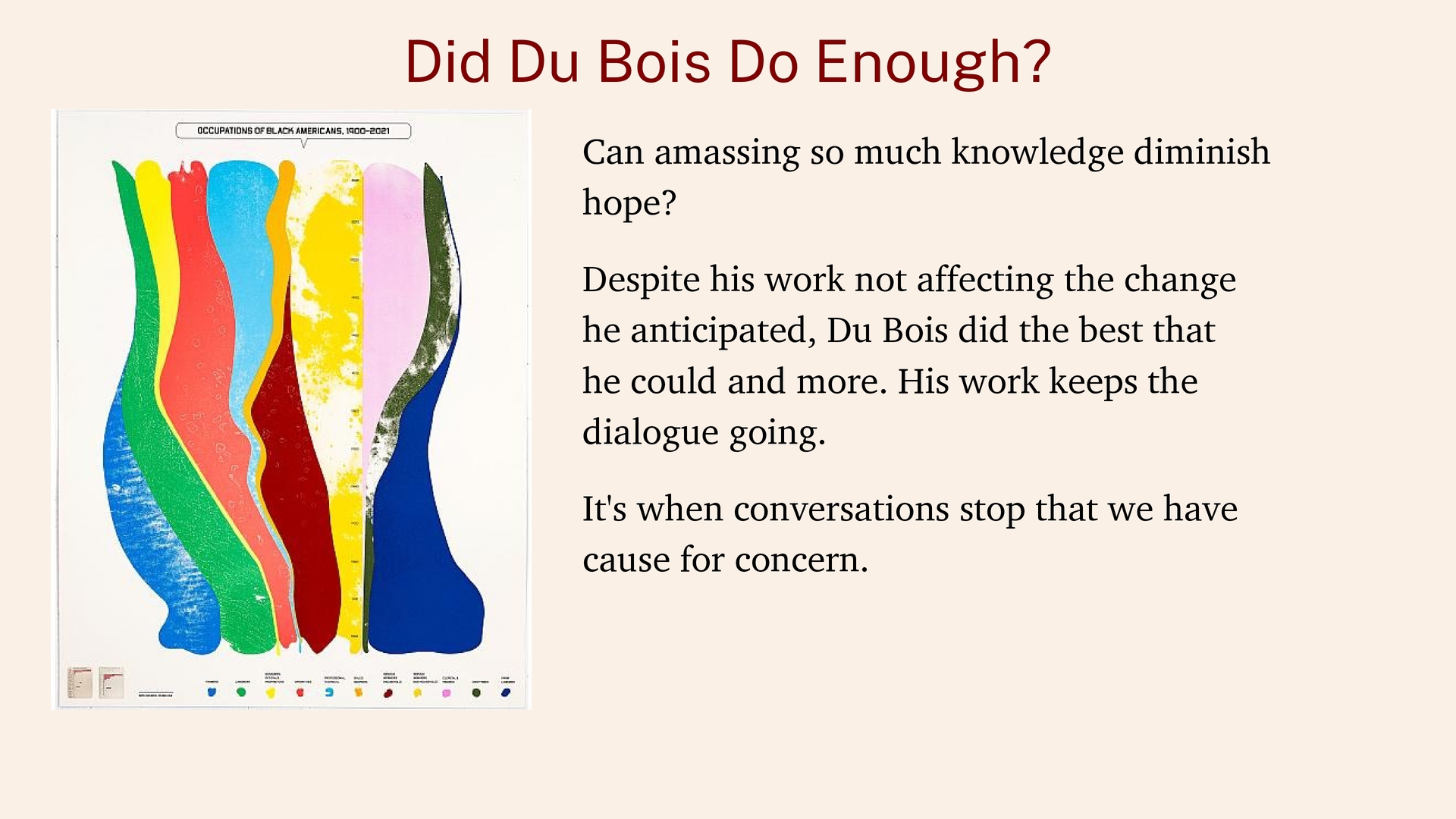 diminish hope? Despite his work not affecting the change he anticipated, Du Bois did the best that he could and more. His work keeps the dialogue going. It's when conversations stop that we have cause for concern.