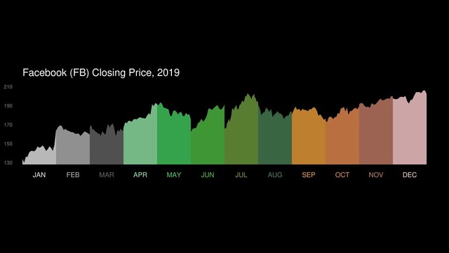 Using the FAANG companies (Facebook, Amazon, Apple, Netflix and Google) as subjects, individual area stock charts for each month are combined to show the yearly performance. Each month has its own color related to the seasons (as seen in the Northern Hemisphere).