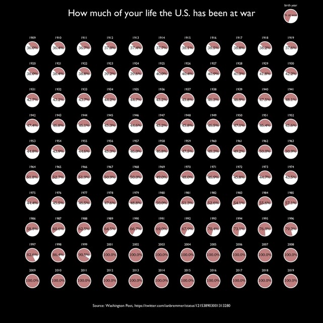 war Source: Washington Post, https://twitter.com/ianbremmer/status/121538903001313280 birth year % at war 1909 1910 1911 1912 1913 1914 1915 1916 1917 1918 1919 1920 1921 1922 1923 1924 1925 1926 1927 1928 1929 1930 1931 1932 1933 1934 1935 1936 1937 1938 1939 1940 1941 1942 1943 1944 1945 1946 1947 1948 1949 1950 1951 1952 1953 1954 1955 1956 1957 1958 1959 1960 1961 1962 1963 1964 1965 1966 1967 1968 1969 1970 1971 1972 1973 1974 1975 1976 1977 1978 1979 1980 1981 1982 1983 1984 1985 1986 1987 1988 1989 1990 1991 1992 1993 1994 1995 1996 1997 1998 1999 2001 2002 2003 2004 2005 2006 2007 2008 2009 2010 2011 2012 2013 2014 2015 2016 2017 2018 2019 36.0% 36.4% 36.7% 37.0% 37.4% 37.7% 38.1% 38.5% 38.8% 38.2% 37.6% 38.0% 38.4% 38.8% 39.2% 39.6% 40.0% 40.4% 40.9% 41.3% 41.8% 42.2% 42.7% 43.2% 43.7% 44.2% 44.7% 45.2% 45.8% 46.3% 46.9% 47.5% 48.1% 47.4% 46.8% 46.1% 45.3% 44.6% 45.2% 45.8% 46.5% 47.1% 46.4% 45.6% 44.8% 43.9% 44.6% 45.3% 46.0% 46.8% 47.5% 48.3% 49.2% 50.0% 50.9% 51.8% 52.7% 51.9% 50.9% 50.0% 49.0% 48.0% 46.9% 45.8% 44.7% 43.5% 44.4% 45.5% 46.5% 47.6% 48.8% 50.0% 51.3% 52.6% 54.1% 55.6% 57.1% 58.8% 60.6% 62.5% 64.5% 66.7% 69.0% 67.9% 70.4% 73.1% 76.0% 79.2% 82.6% 86.4% 90.5% 100.0% 100.0% 100.0% 100.0% 100.0% 100.0% 100.0% 100.0% 100.0% 100.0% 100.0% 100.0% 100.0% 100.0% 100.0% 100.0% 100.0% 100.0% 100.0%