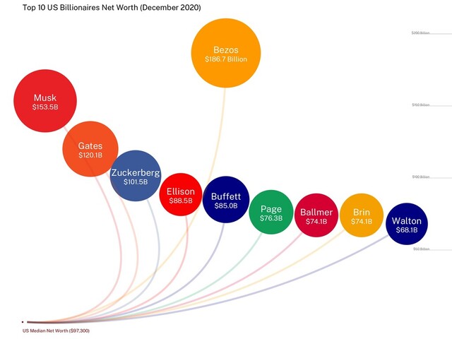 $100 Billion $150 Billion $200 Billion Bezos Musk Gates Zuckerberg Ellison Buffett Page Ballmer Brin Walton US Median Net Worth ($97,300) $186.7 Billion $153.5B $120.1B $101.5B $88.5B $85.0B $76.3B $74.1B $74.1B $68.1B