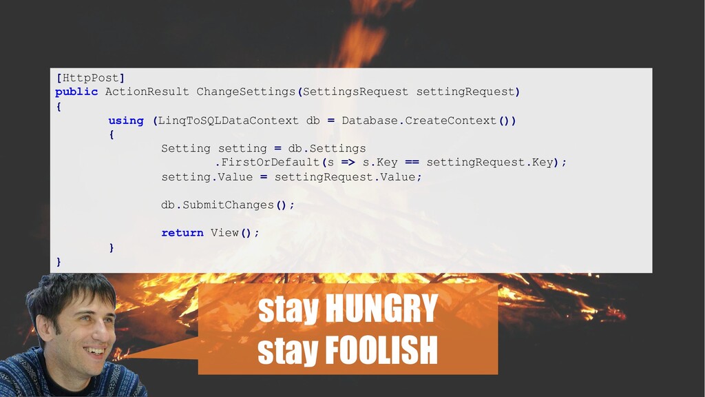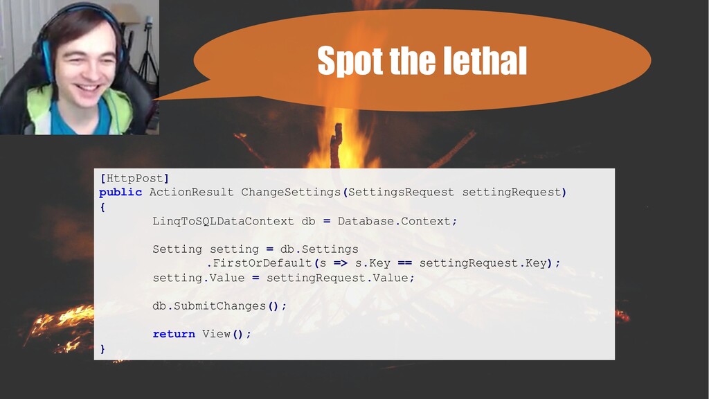 Setting setting = db.Settings .FirstOrDefault(s => s.Key == settingRequest.Key); setting.Value = settingRequest.Value; db.SubmitChanges(); return View(); } Spot the lethal