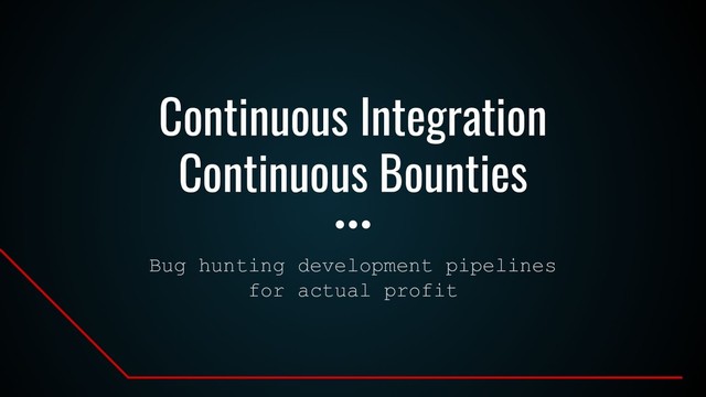 for bug hunting Continuous Integration / Continuous Deployment (CI/CD) pipelines • I am not going to touch framework bugs here (Jenkins, GitLab Runner, etc.) • I will present a few implementation, configuration and logic issues which I have found IRL on various Bug Bounty programs • I will detail some of the tooling I use when assessing these environments