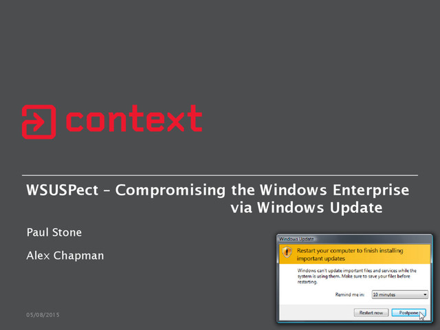 update traffic Updates are signed so cannot be modified We could: – Prevent updates being applied? – Force drivers to be downloaded and installed? – Remove security patches then attack system? Let’s look at the web service 05/08/2015