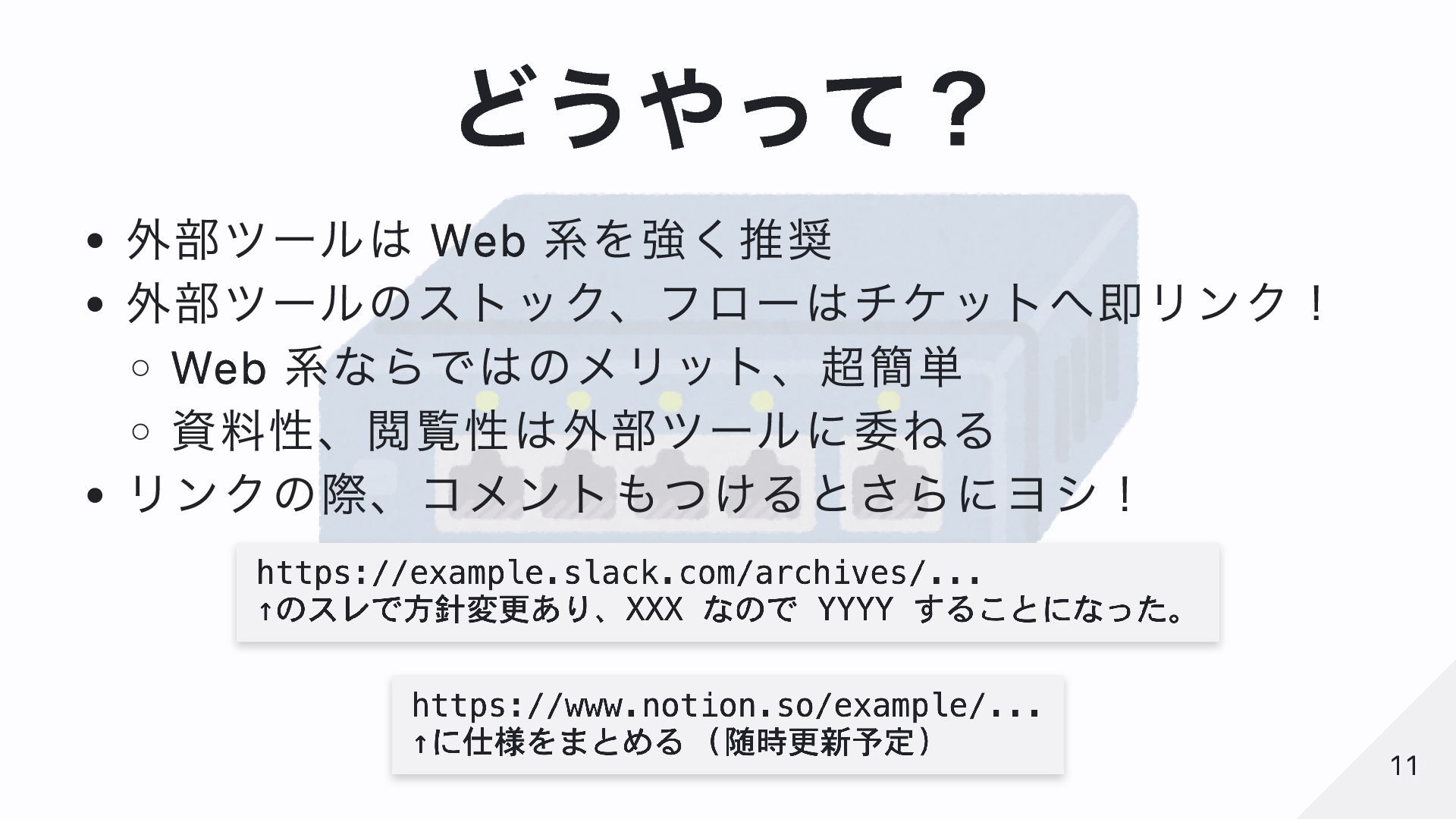 どうやって? 外部ツールは Web 系を強く推奨 外部ツールのストック、フローはチケットへ即リンク! Web 系ならではのメリット、超簡単 資料性、閲覧性は外部ツールに委ねる リンクの際、コメントもつけるとさらにヨシ! 11