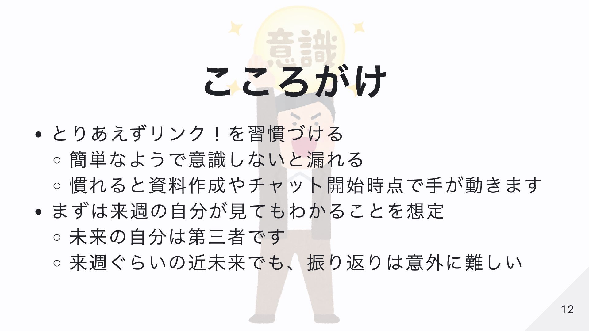 こころがけ とりあえずリンク!を習慣づける 簡単なようで意識しないと漏れる 慣れると資料作成やチャット開始時点で手が動きます まずは来週の自分が見てもわかることを想定 未来の自分は第三者です 来週ぐらいの近未来でも、振り返りは意外に難しい 12 12