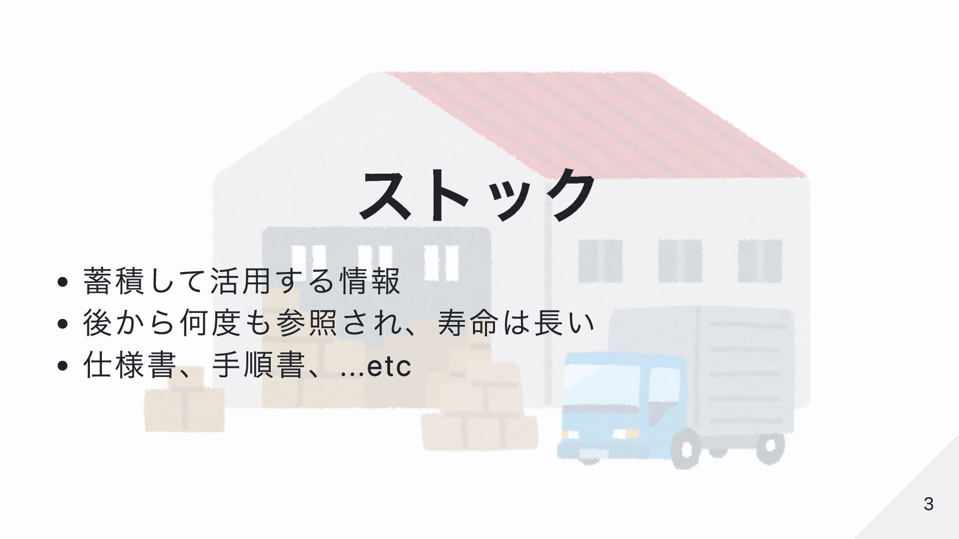 ストック 蓄積して活用する情報 後から何度も参照され、寿命は長い 仕様書、手順書、...etc 3 3