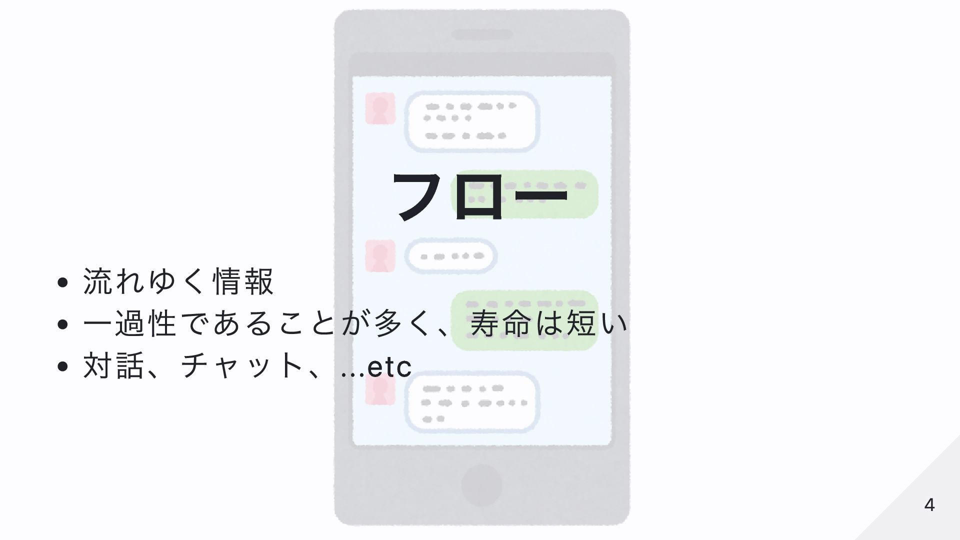 フロー 流れゆく情報 一過性であることが多く、寿命は短い 対話、チャット、...etc 4 4
