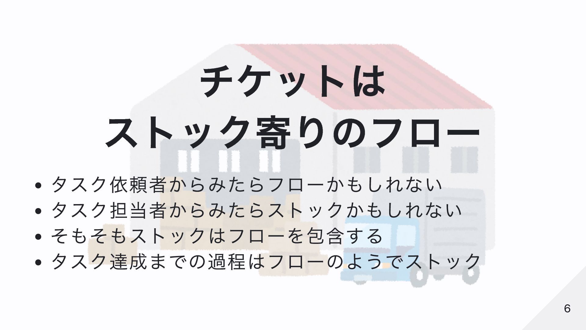 チケットは ストック寄りのフロー タスク依頼者からみたらフローかもしれない タスク担当者からみたらストックかもしれない そもそもストックはフローを包含する タスク達成までの過程はフローのようでストック 6 6