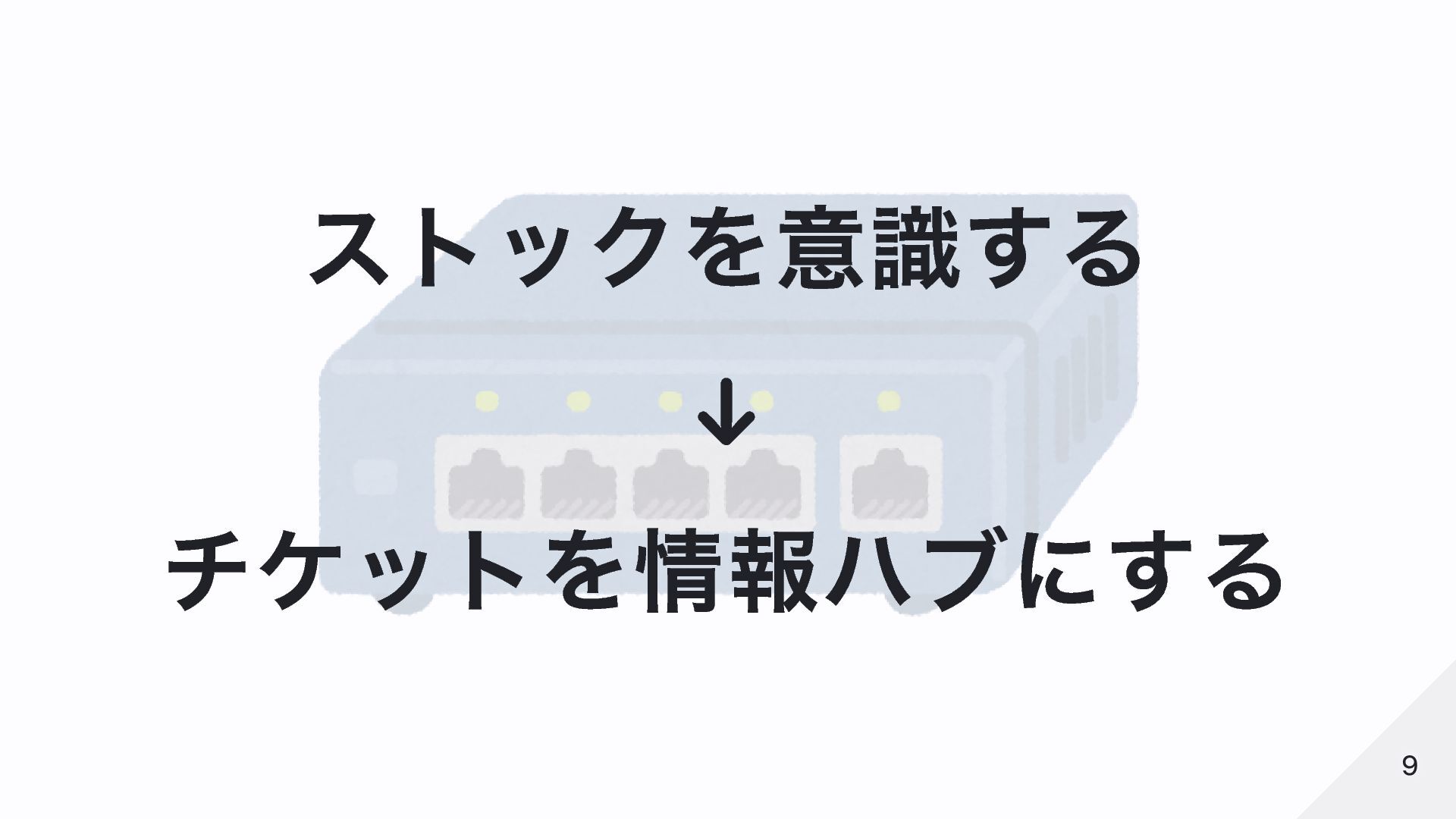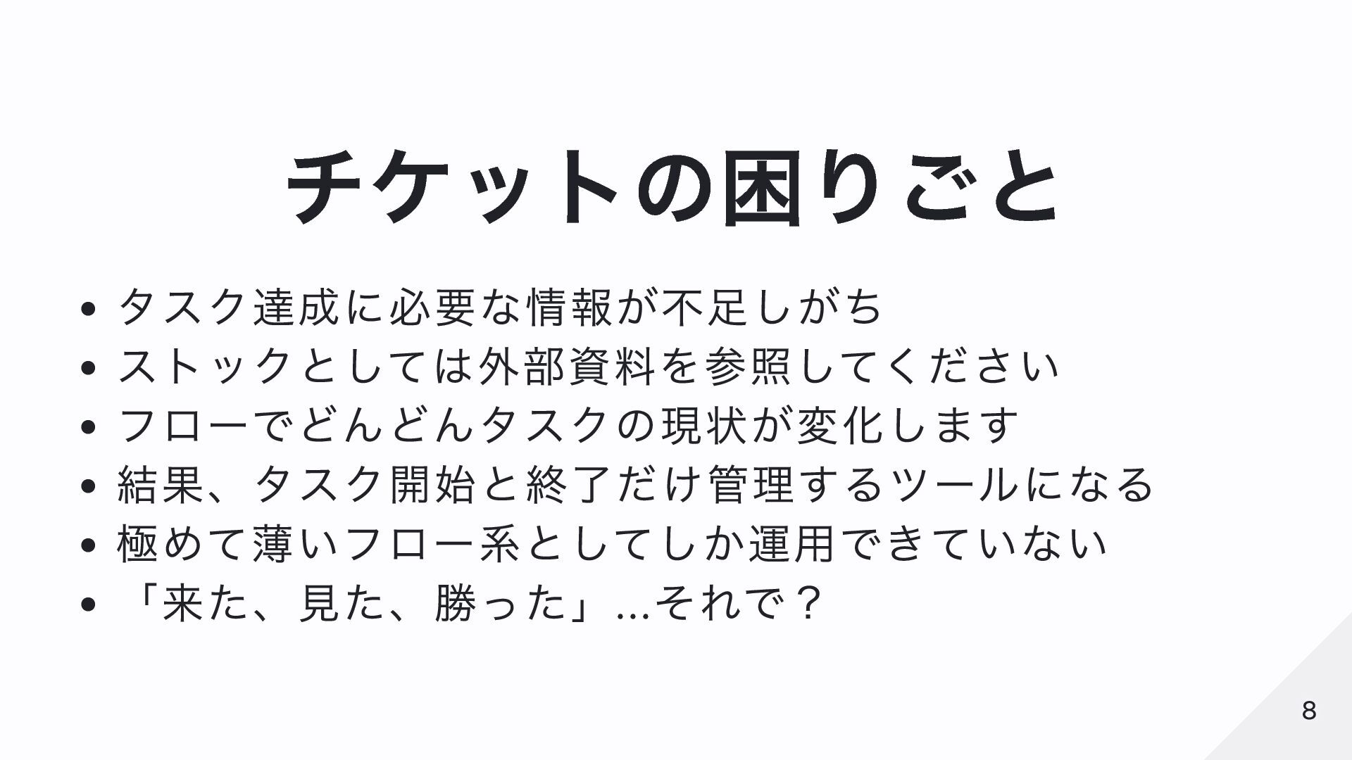 チケットの困りごと タスク達成に必要な情報が不足しがち ストックとしては外部資料を参照してください フローでどんどんタスクの現状が変化します 結果、タスク開始と終了だけ管理するツールになる 極めて薄いフロー系としてしか運用できていない 「来た、見た、勝った」...それで? 8 8