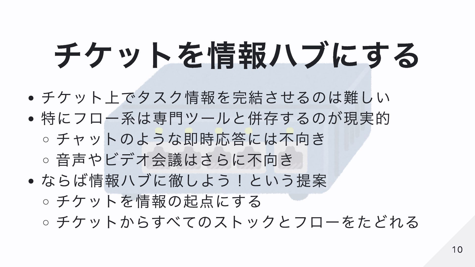 チケットを情報ハブにする チケット上でタスク情報を完結させるのは難しい 特にフロー系は専門ツールと併存するのが現実的 チャットのような即時応答には不向き 音声やビデオ会議はさらに不向き ならば情報ハブに徹しよう!という提案 チケットを情報の起点にする チケットからすべてのストックとフローをたどれる 10 10