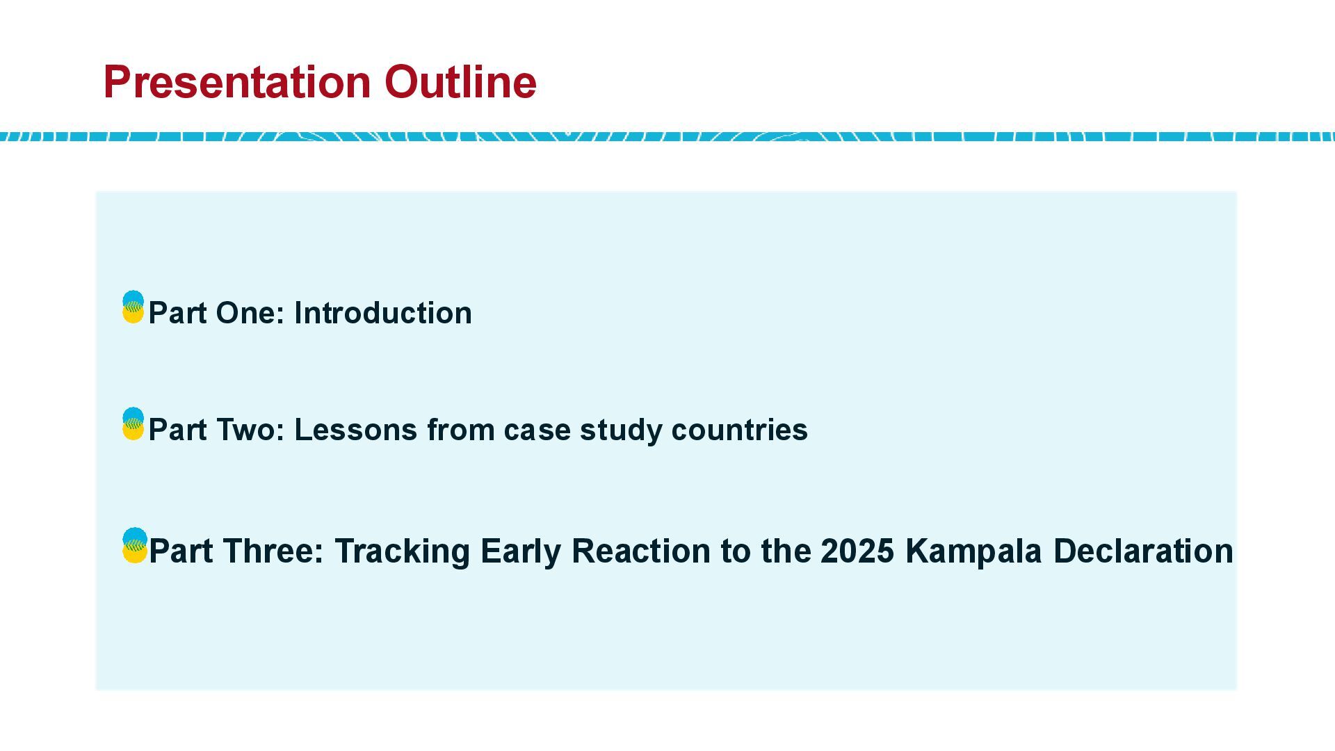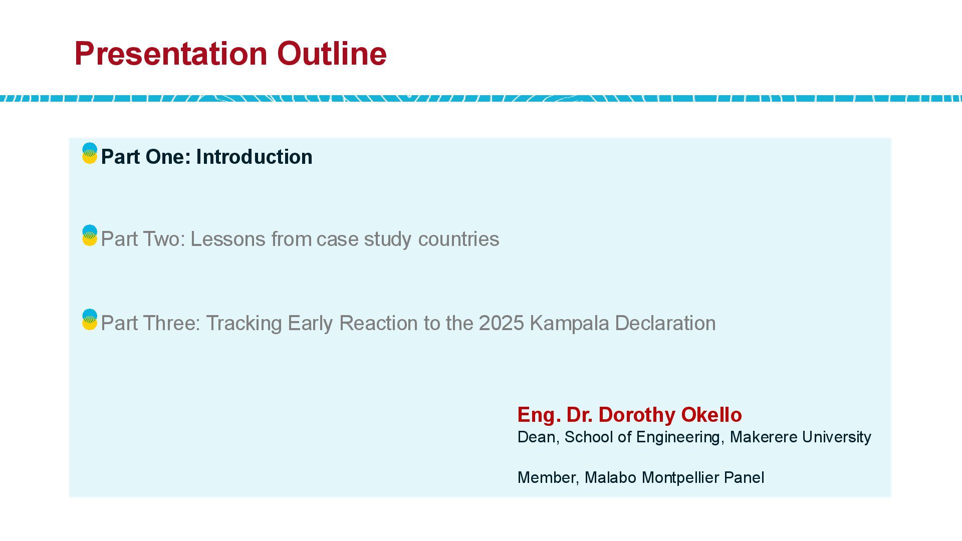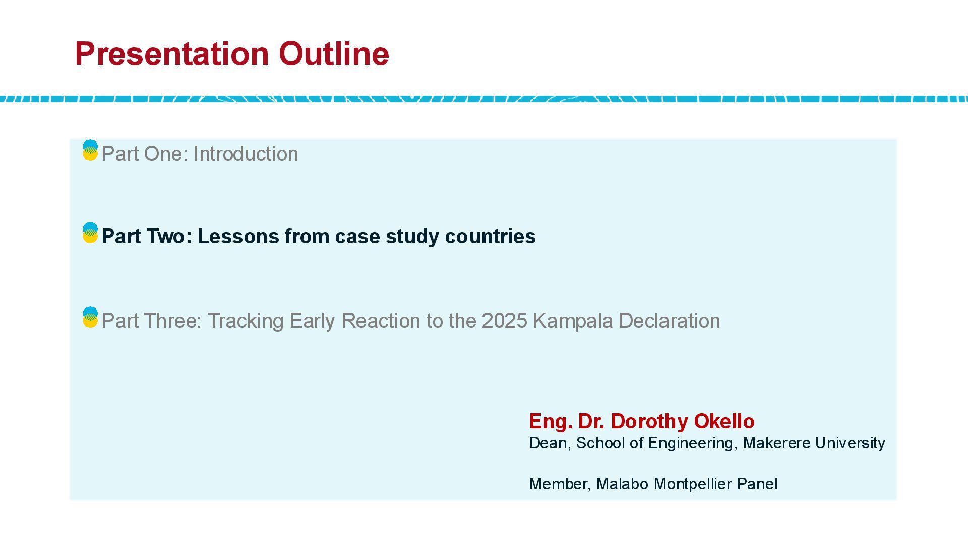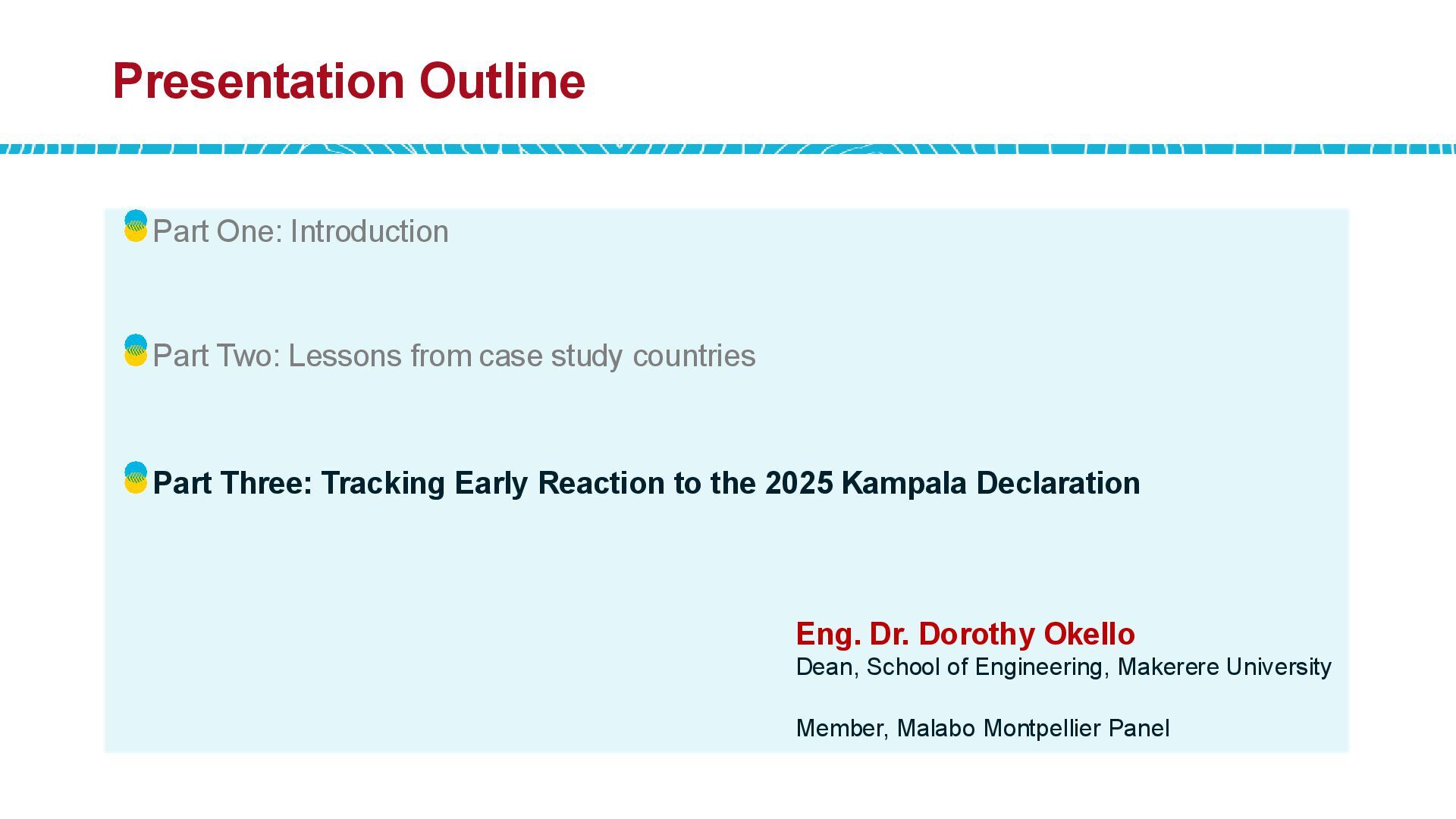 study countries Part Three: Tracking Early Reaction to the 2025 Kampala Declaration Eng. Dr. Dorothy Okello Dean, School of Engineering, Makerere University Member, Malabo Montpellier Panel