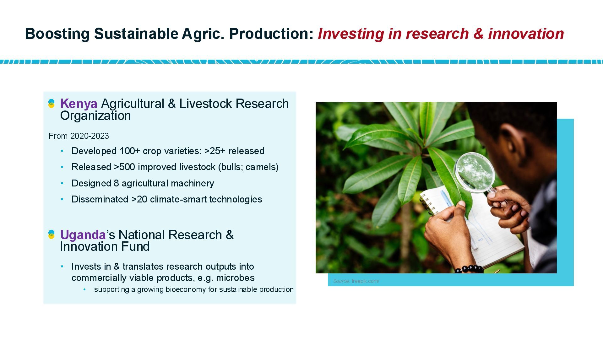 Agricultural & Livestock Research Organization From 2020-2023 • Developed 100+ crop varieties: >25+ released • Released >500 improved livestock (bulls; camels) • Designed 8 agricultural machinery • Disseminated >20 climate-smart technologies Uganda’s National Research & Innovation Fund • Invests in & translates research outputs into commercially viable products, e.g. microbes • supporting a growing bioeconomy for sustainable production Source: freepik.com/