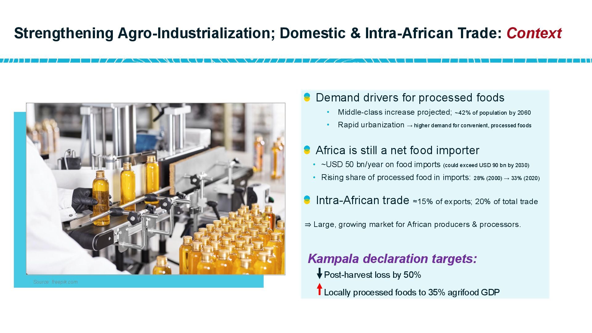 processed foods • Middle-class increase projected; ~42% of population by 2060 • Rapid urbanization → higher demand for convenient, processed foods Africa is still a net food importer • ~USD 50 bn/year on food imports (could exceed USD 90 bn by 2030) • Rising share of processed food in imports: 28% (2000) → 33% (2020) Intra-African trade ≈15% of exports; 20% of total trade ⇒ Large, growing market for African producers & processors. Kampala declaration targets: Post-harvest loss by 50% Locally processed foods to 35% agrifood GDP Source: freepik.com