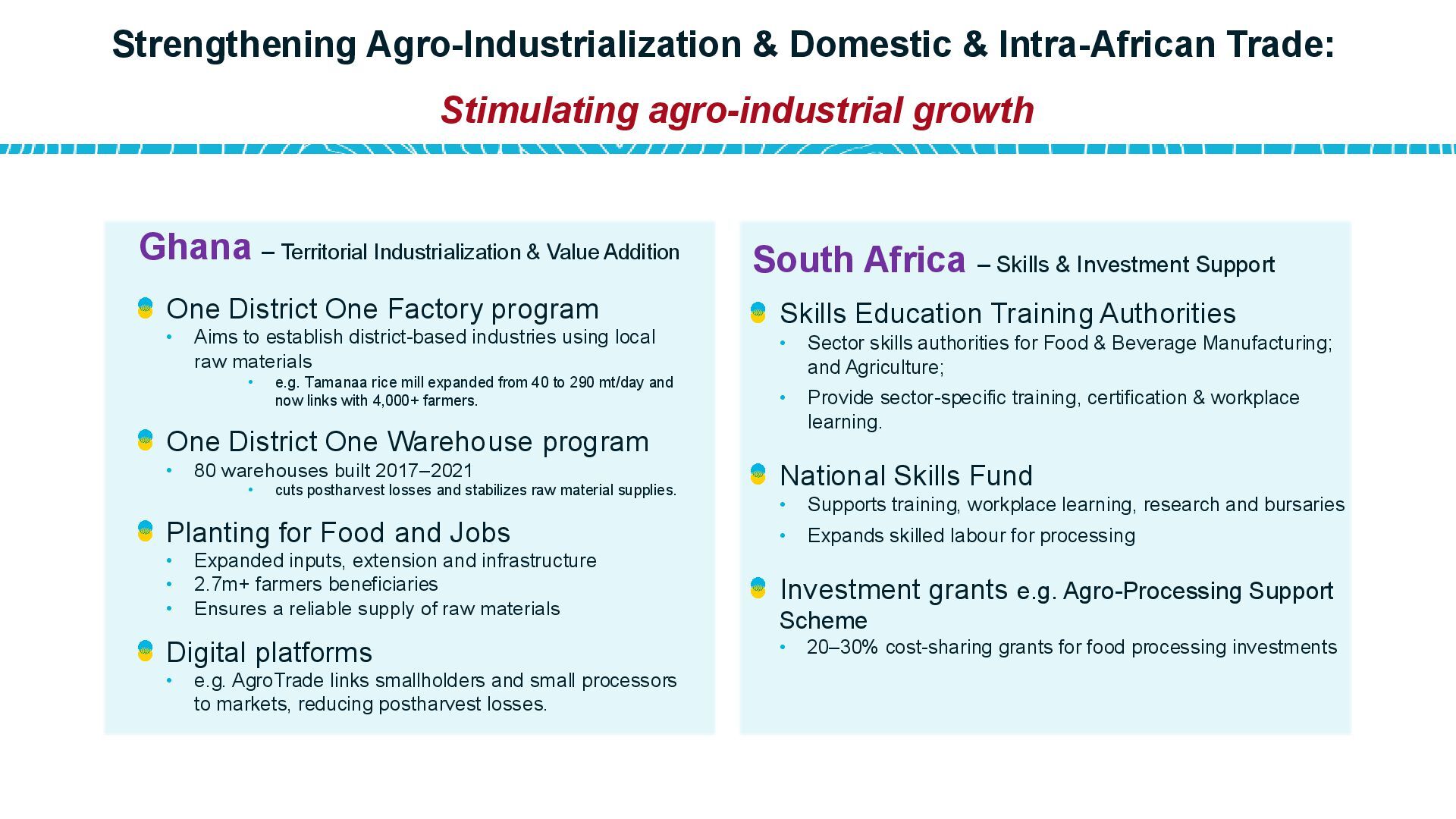 Ghana – Territorial Industrialization & Value Addition One District One Factory program • Aims to establish district-based industries using local raw materials • e.g. Tamanaa rice mill expanded from 40 to 290 mt/day and now links with 4,000+ farmers. One District One Warehouse program • 80 warehouses built 2017–2021 • cuts postharvest losses and stabilizes raw material supplies. Planting for Food and Jobs • Expanded inputs, extension and infrastructure • 2.7m+ farmers beneficiaries • Ensures a reliable supply of raw materials Digital platforms • e.g. AgroTrade links smallholders and small processors to markets, reducing postharvest losses. South Africa – Skills & Investment Support Skills Education Training Authorities • Sector skills authorities for Food & Beverage Manufacturing; and Agriculture; • Provide sector-specific training, certification & workplace learning. National Skills Fund • Supports training, workplace learning, research and bursaries • Expands skilled labour for processing Investment grants e.g. Agro-Processing Support Scheme • 20–30% cost-sharing grants for food processing investments