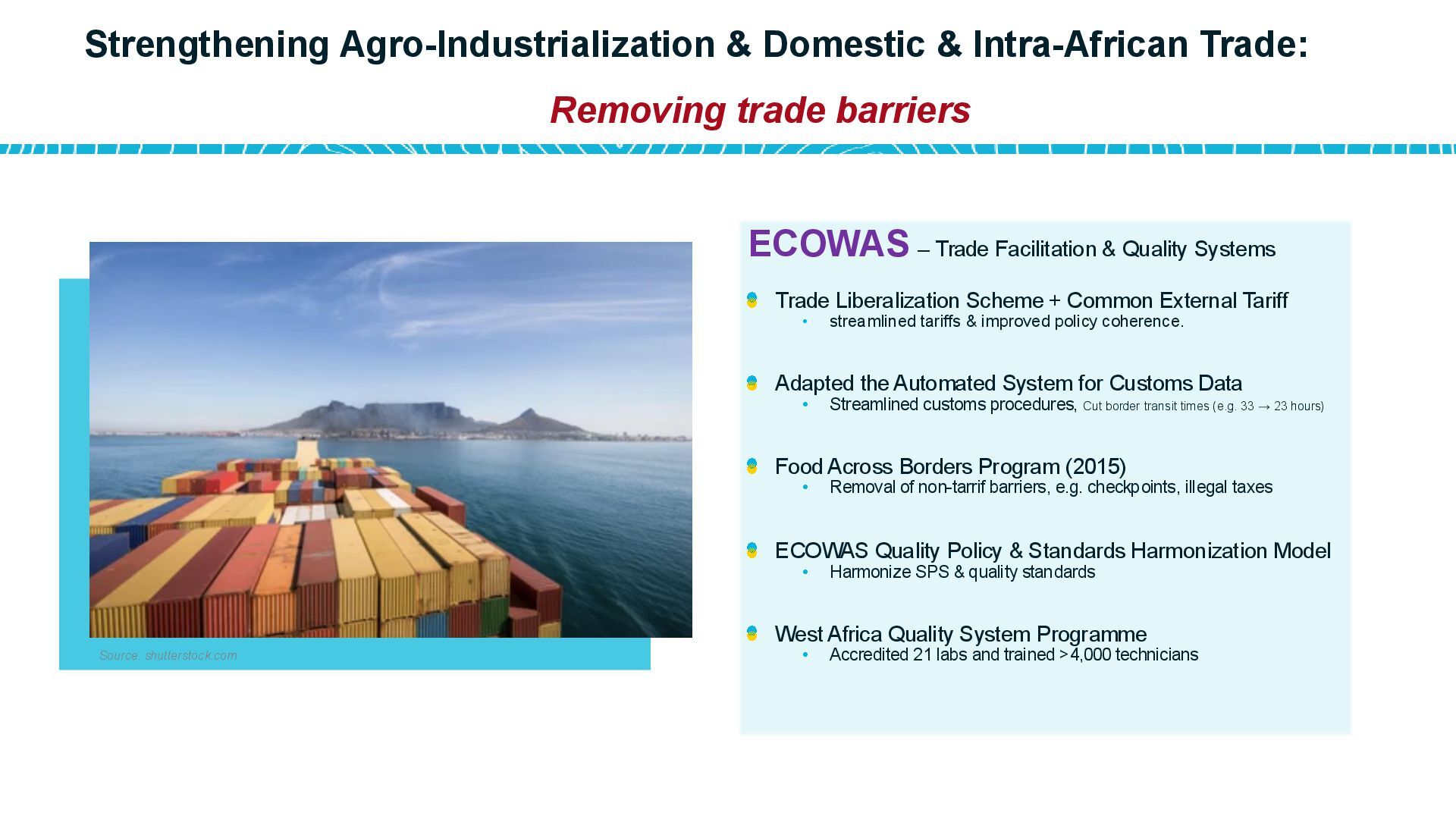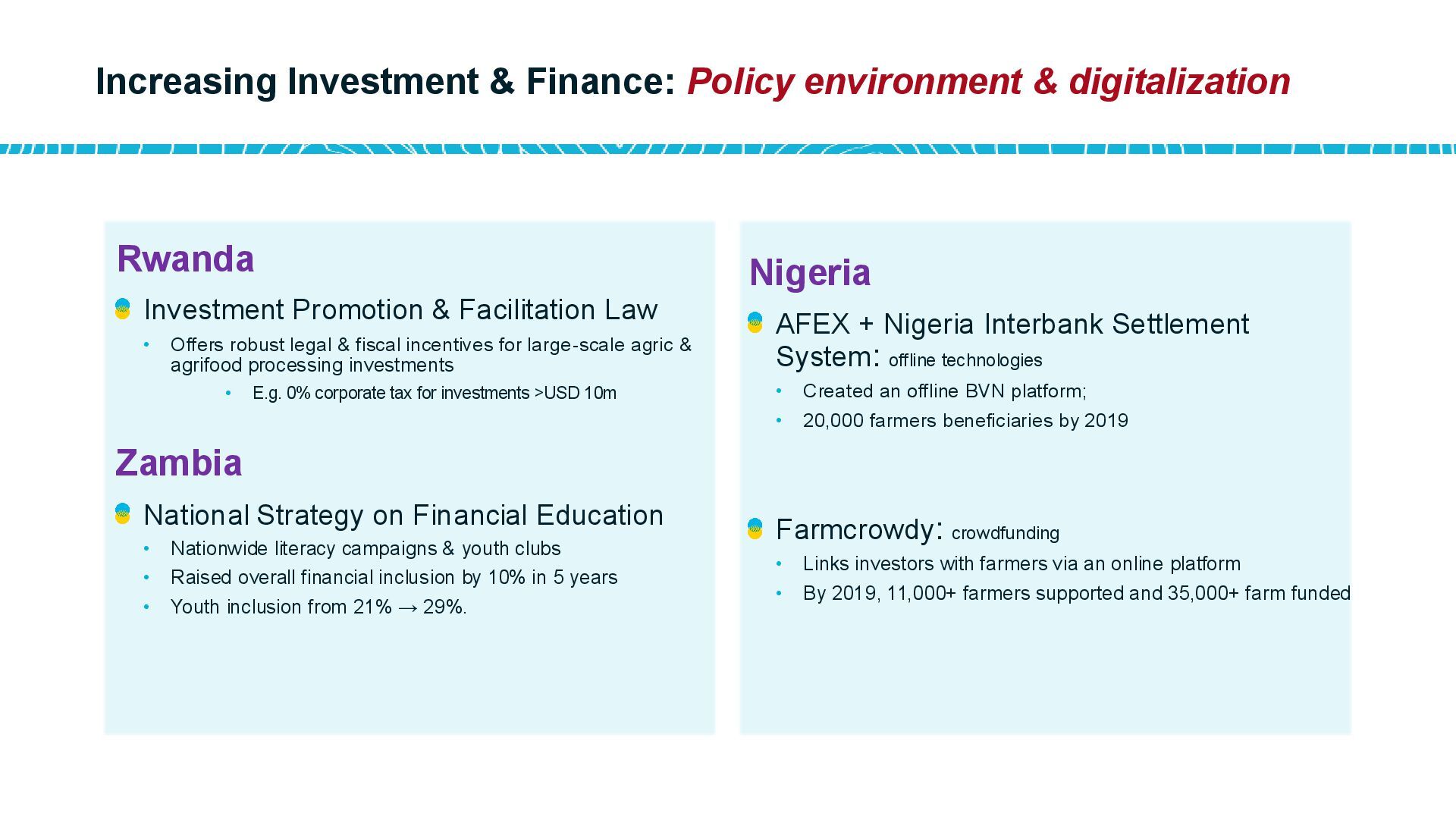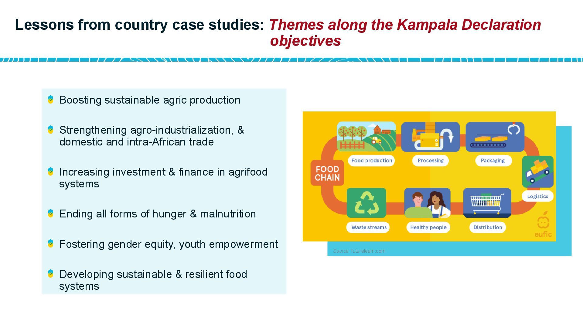 objectives Boosting sustainable agric production Strengthening agro-industrialization, & domestic and intra-African trade Increasing investment & finance in agrifood systems Ending all forms of hunger & malnutrition Fostering gender equity, youth empowerment Developing sustainable & resilient food systems Source: futurelearn.com