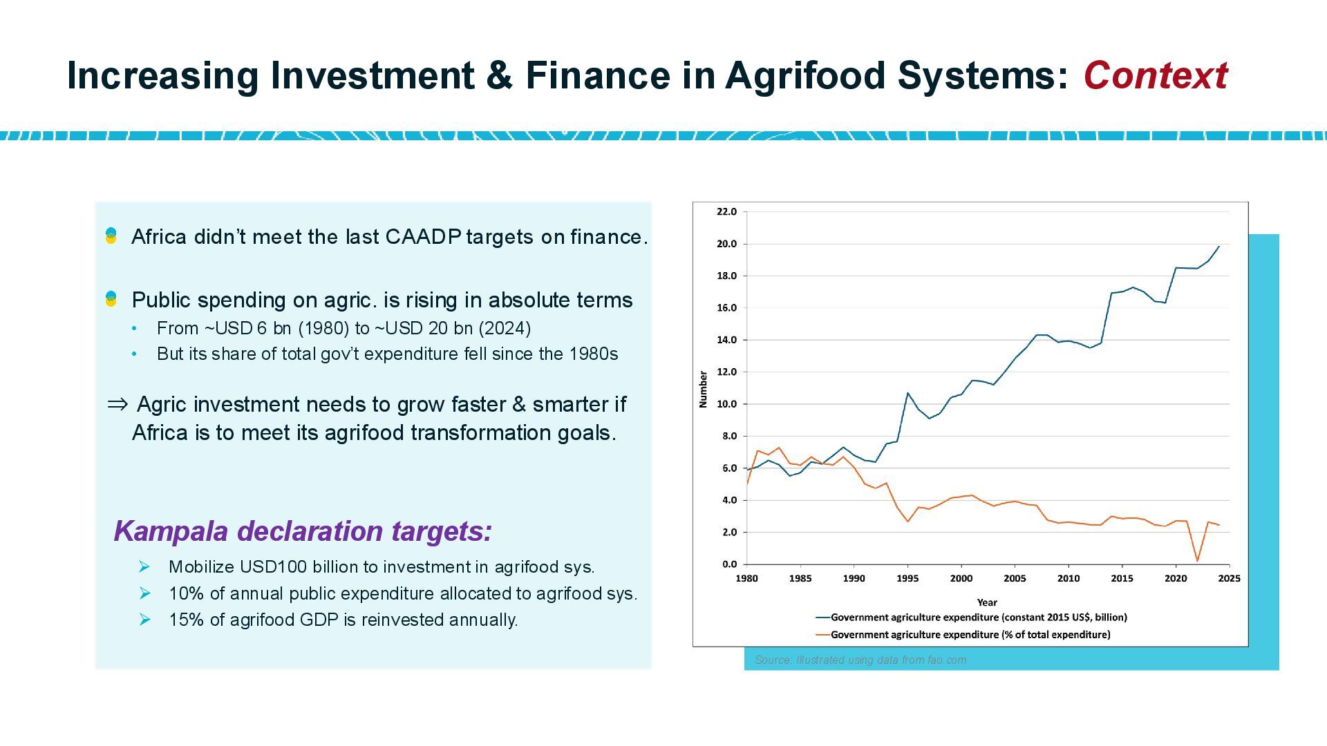 meet the last CAADP targets on finance. Public spending on agric. is rising in absolute terms • From ~USD 6 bn (1980) to ~USD 20 bn (2024) • But its share of total gov’t expenditure fell since the 1980s ⇒ Agric investment needs to grow faster & smarter if Africa is to meet its agrifood transformation goals. Kampala declaration targets: ➢ Mobilize USD100 billion to investment in agrifood sys. ➢ 10% of annual public expenditure allocated to agrifood sys. ➢ 15% of agrifood GDP is reinvested annually. Source: Illustrated using data from fao.com