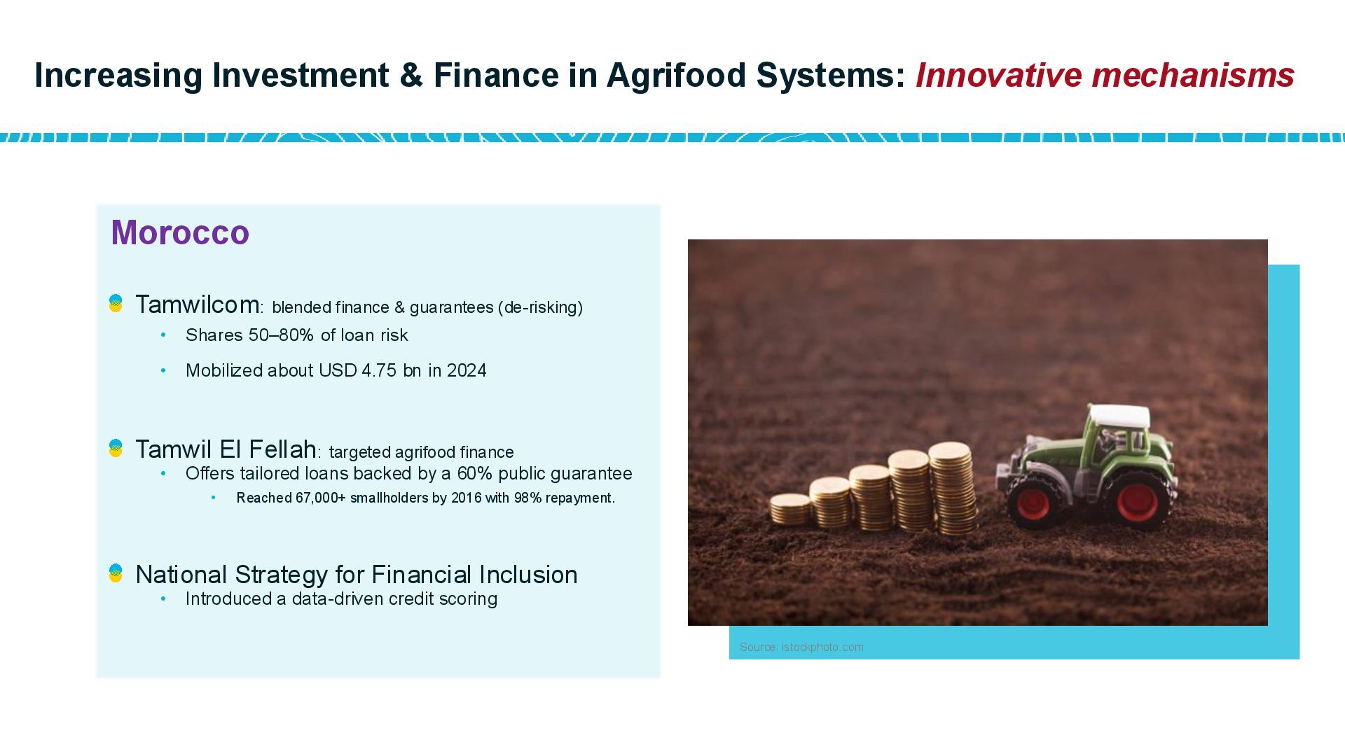 Tamwilcom: blended finance & guarantees (de-risking) • Shares 50–80% of loan risk • Mobilized about USD 4.75 bn in 2024 Tamwil El Fellah: targeted agrifood finance • Offers tailored loans backed by a 60% public guarantee • Reached 67,000+ smallholders by 2016 with 98% repayment. National Strategy for Financial Inclusion • Introduced a data-driven credit scoring Source: istockphoto.com