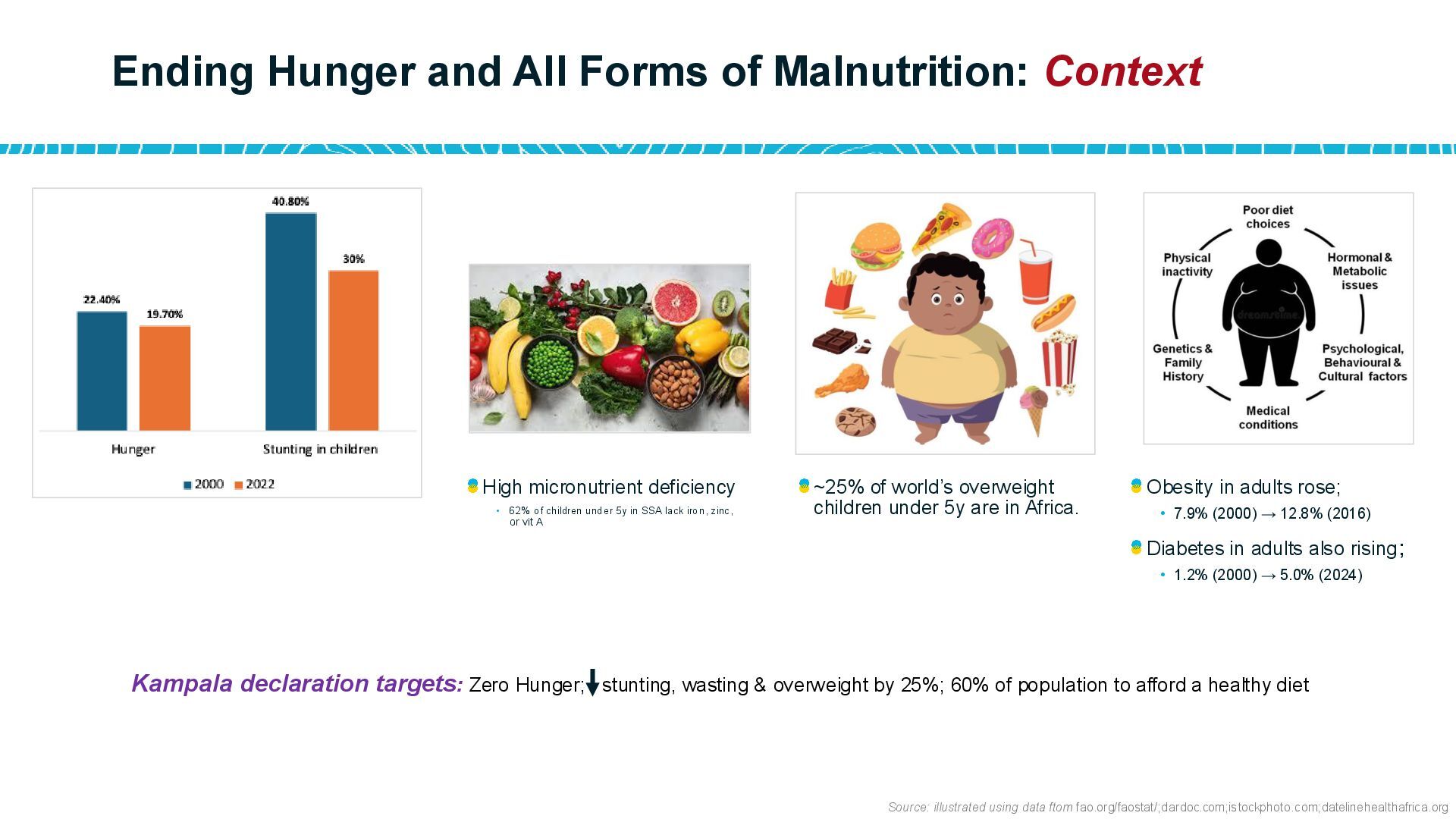 Obesity in adults rose; • 7.9% (2000) → 12.8% (2016) Diabetes in adults also rising; • 1.2% (2000) → 5.0% (2024) High micronutrient deficiency • 62% of children under 5y in SSA lack iron, zinc, or vit A Source: illustrated using data ftom fao.org/faostat/;dardoc.com;istockphoto.com;datelinehealthafrica.org Ending Hunger and All Forms of Malnutrition: Context Kampala declaration targets: Zero Hunger; stunting, wasting & overweight by 25%; 60% of population to afford a healthy diet
