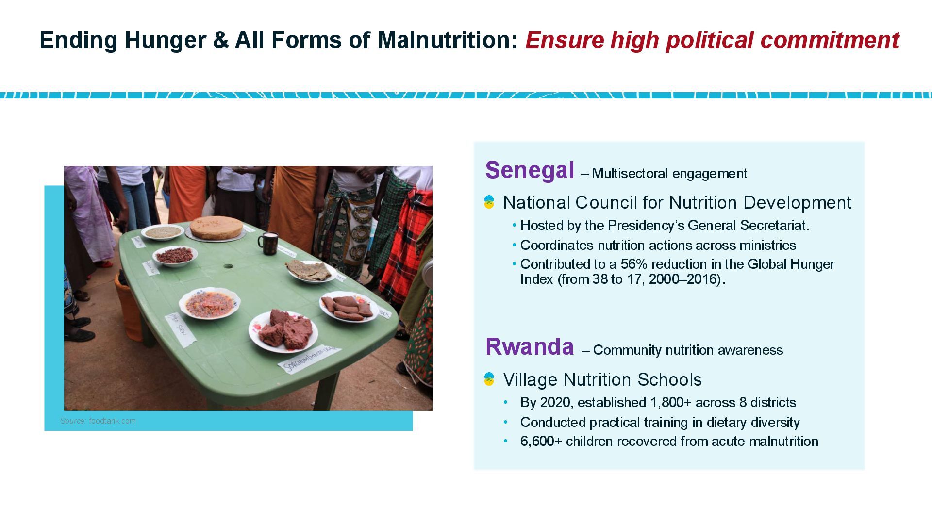 commitment Senegal – Multisectoral engagement National Council for Nutrition Development • Hosted by the Presidency’s General Secretariat. • Coordinates nutrition actions across ministries • Contributed to a 56% reduction in the Global Hunger Index (from 38 to 17, 2000–2016). Rwanda – Community nutrition awareness Village Nutrition Schools • By 2020, established 1,800+ across 8 districts • Conducted practical training in dietary diversity • 6,600+ children recovered from acute malnutrition Source: foodtank.com