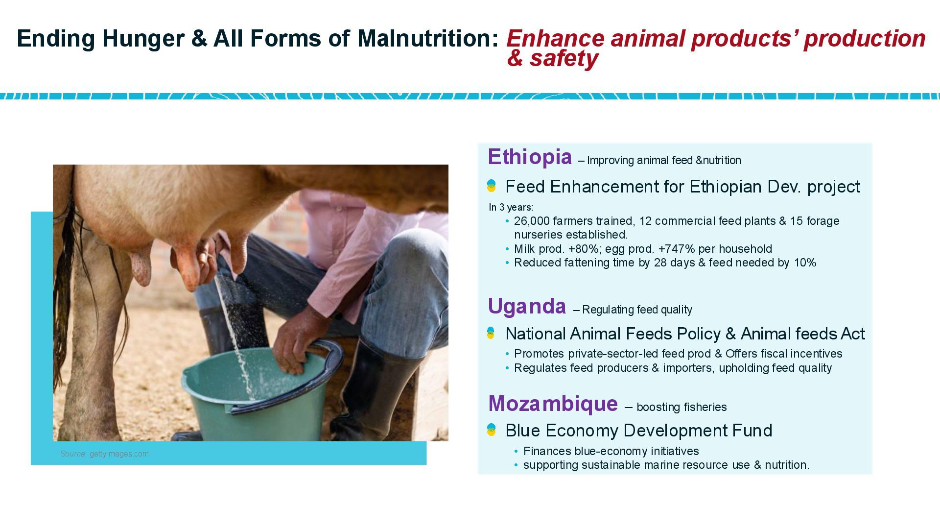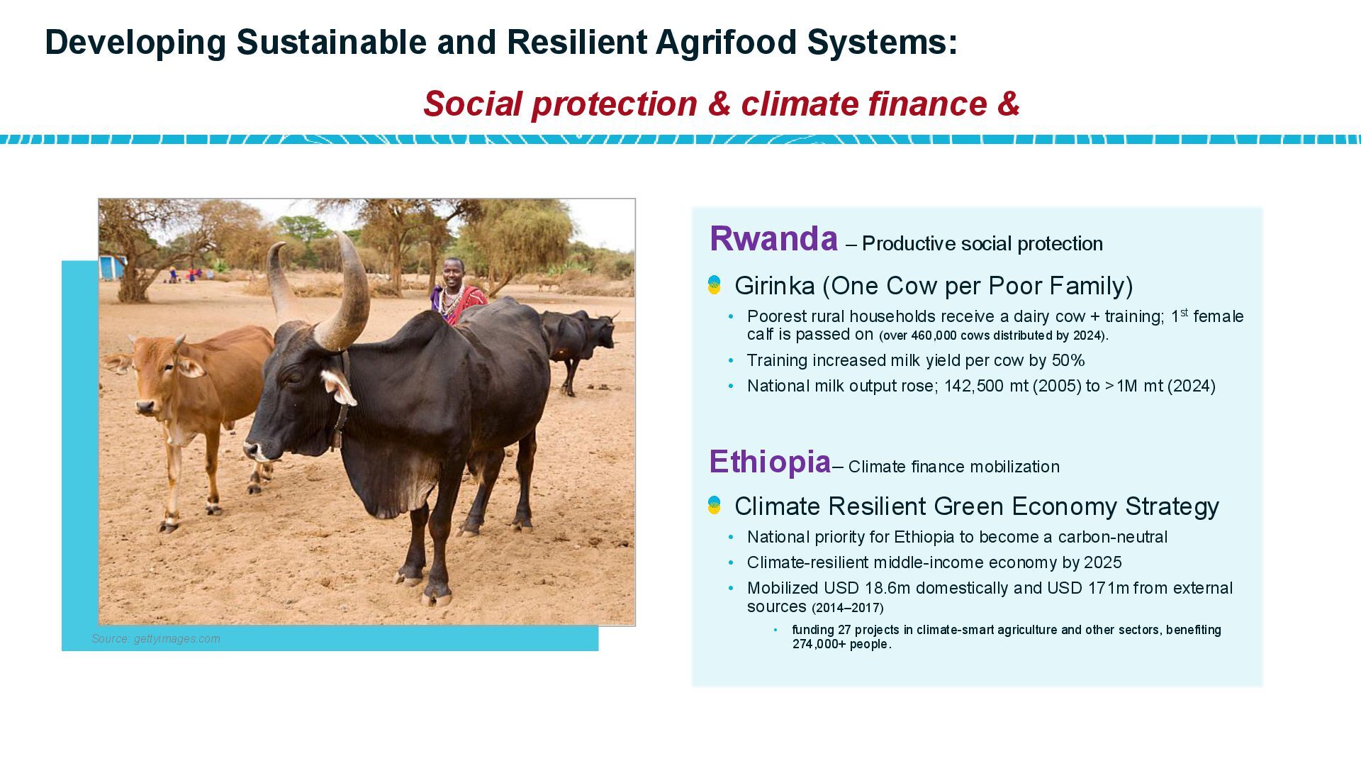 finance & Rwanda – Productive social protection Girinka (One Cow per Poor Family) • Poorest rural households receive a dairy cow + training; 1st female calf is passed on (over 460,000 cows distributed by 2024). • Training increased milk yield per cow by 50% • National milk output rose; 142,500 mt (2005) to >1M mt (2024) Ethiopia– Climate finance mobilization Climate Resilient Green Economy Strategy • National priority for Ethiopia to become a carbon-neutral • Climate-resilient middle-income economy by 2025 • Mobilized USD 18.6m domestically and USD 171m from external sources (2014–2017) • funding 27 projects in climate-smart agriculture and other sectors, benefiting 274,000+ people. Source: gettyimages.com