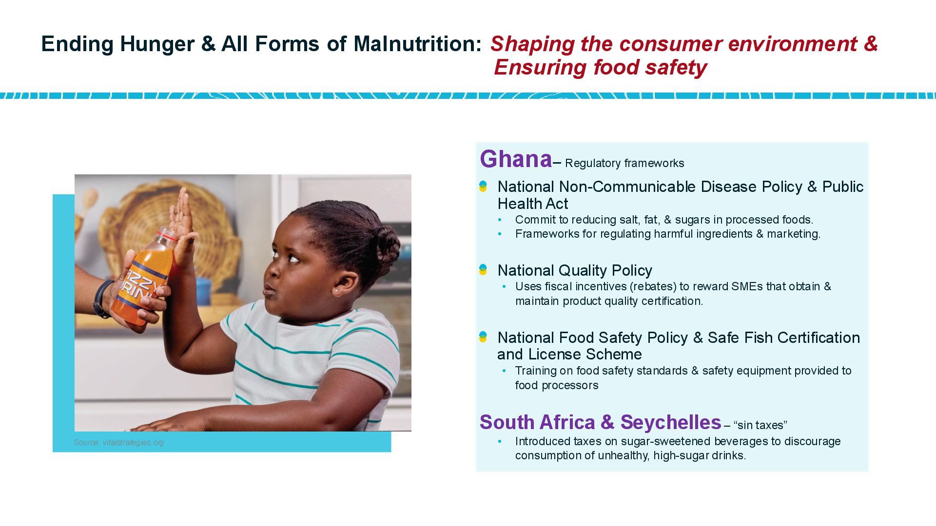 environment & Ensuring food safety Ghana– Regulatory frameworks National Non-Communicable Disease Policy & Public Health Act • Commit to reducing salt, fat, & sugars in processed foods. • Frameworks for regulating harmful ingredients & marketing. National Quality Policy • Uses fiscal incentives (rebates) to reward SMEs that obtain & maintain product quality certification. National Food Safety Policy & Safe Fish Certification and License Scheme • Training on food safety standards & safety equipment provided to food processors South Africa & Seychelles – “sin taxes” • Introduced taxes on sugar-sweetened beverages to discourage consumption of unhealthy, high-sugar drinks. Source: vitalstrategies.org