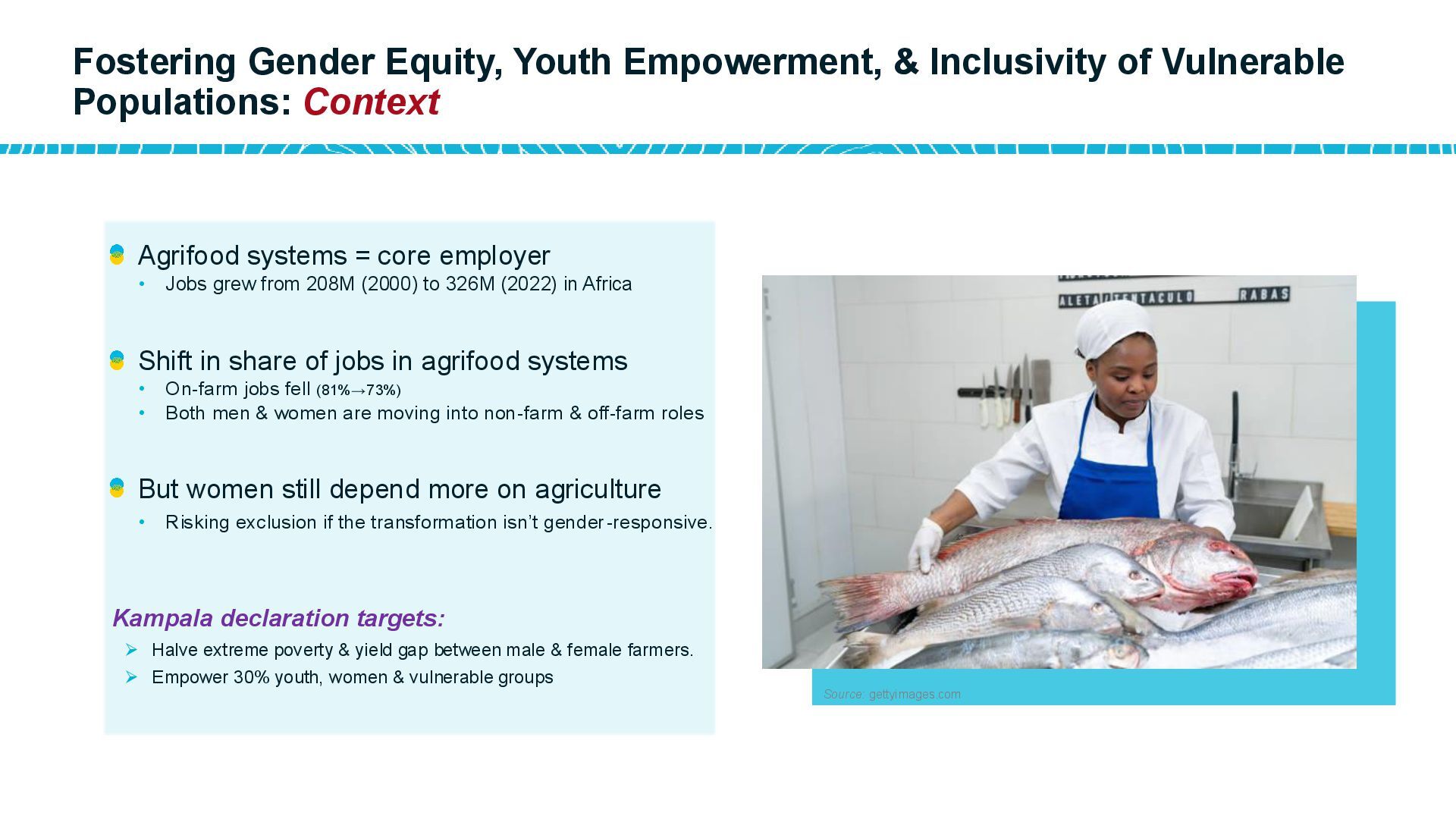Context Agrifood systems = core employer • Jobs grew from 208M (2000) to 326M (2022) in Africa Shift in share of jobs in agrifood systems • On-farm jobs fell (81%→73%) • Both men & women are moving into non-farm & off-farm roles But women still depend more on agriculture • Risking exclusion if the transformation isn’t gender-responsive. Kampala declaration targets: ➢ Halve extreme poverty & yield gap between male & female farmers. ➢ Empower 30% youth, women & vulnerable groups Source: gettyimages.com