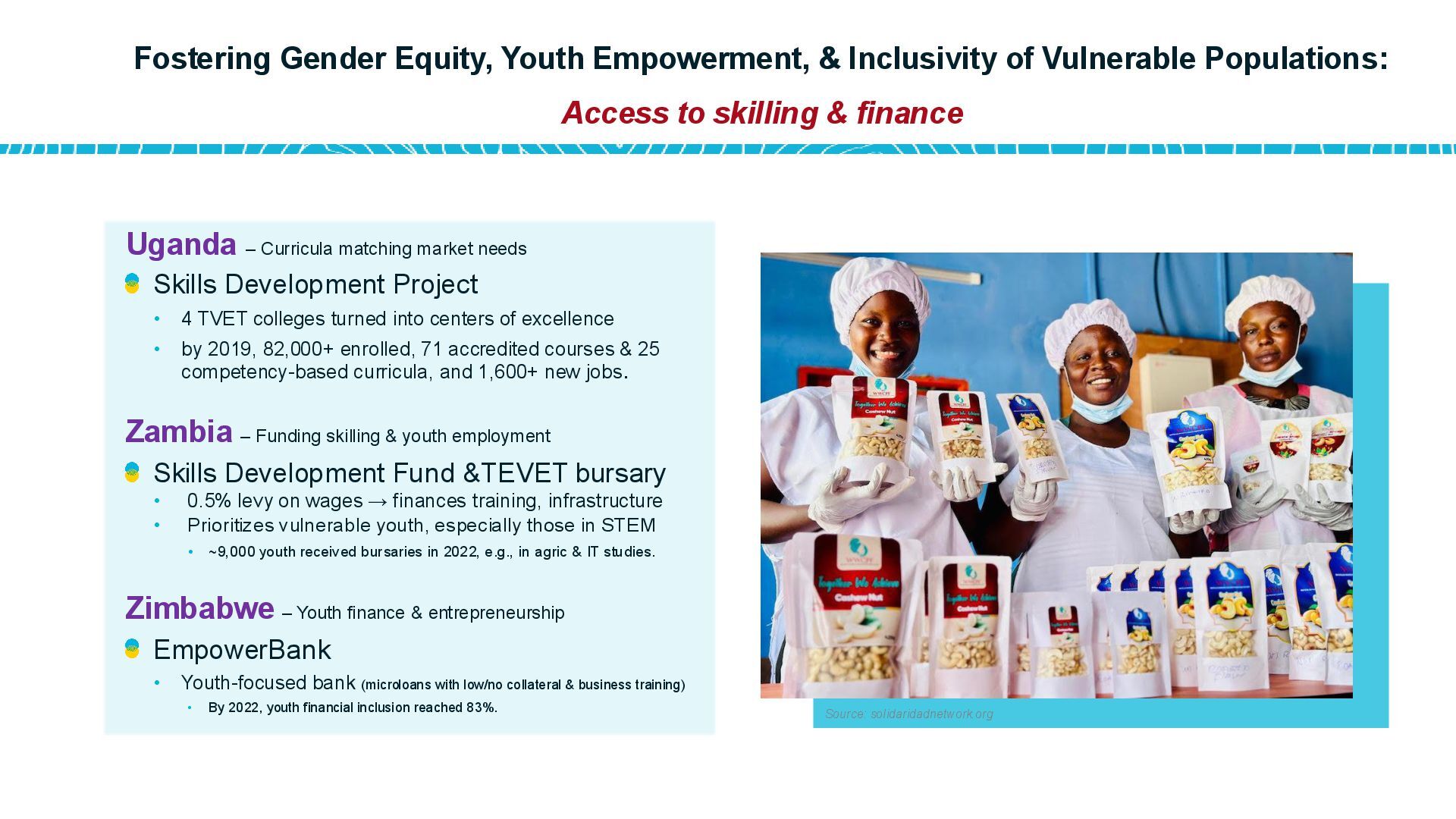 Access to skilling & finance Uganda – Curricula matching market needs Skills Development Project • 4 TVET colleges turned into centers of excellence • by 2019, 82,000+ enrolled, 71 accredited courses & 25 competency-based curricula, and 1,600+ new jobs. Zambia – Funding skilling & youth employment Skills Development Fund &TEVET bursary • 0.5% levy on wages → finances training, infrastructure • Prioritizes vulnerable youth, especially those in STEM • ~9,000 youth received bursaries in 2022, e.g., in agric & IT studies. Zimbabwe – Youth finance & entrepreneurship EmpowerBank • Youth-focused bank (microloans with low/no collateral & business training) • By 2022, youth financial inclusion reached 83%. Source: solidaridadnetwork.org