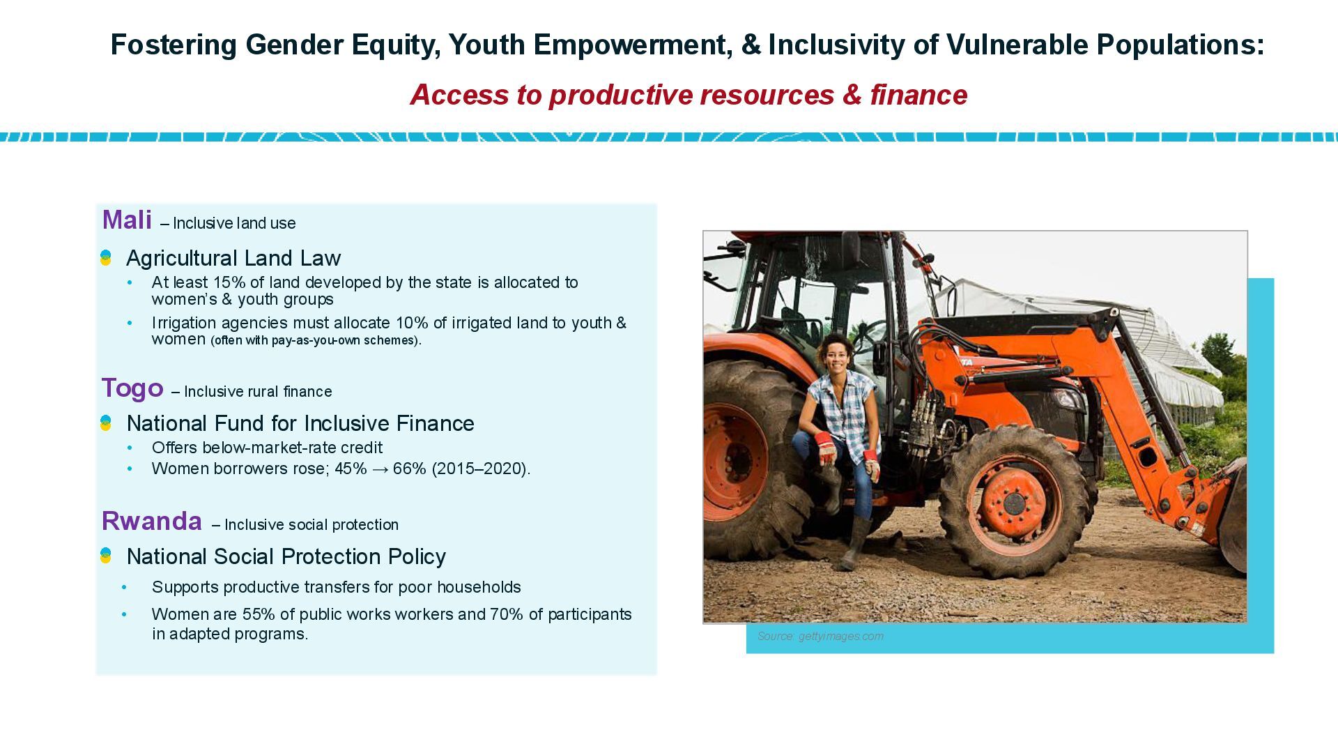 Access to productive resources & finance Mali – Inclusive land use Agricultural Land Law • At least 15% of land developed by the state is allocated to women’s & youth groups • Irrigation agencies must allocate 10% of irrigated land to youth & women (often with pay-as-you-own schemes). Togo – Inclusive rural finance National Fund for Inclusive Finance • Offers below-market-rate credit • Women borrowers rose; 45% → 66% (2015–2020). Rwanda – Inclusive social protection National Social Protection Policy • Supports productive transfers for poor households • Women are 55% of public works workers and 70% of participants in adapted programs. Source: gettyimages.com