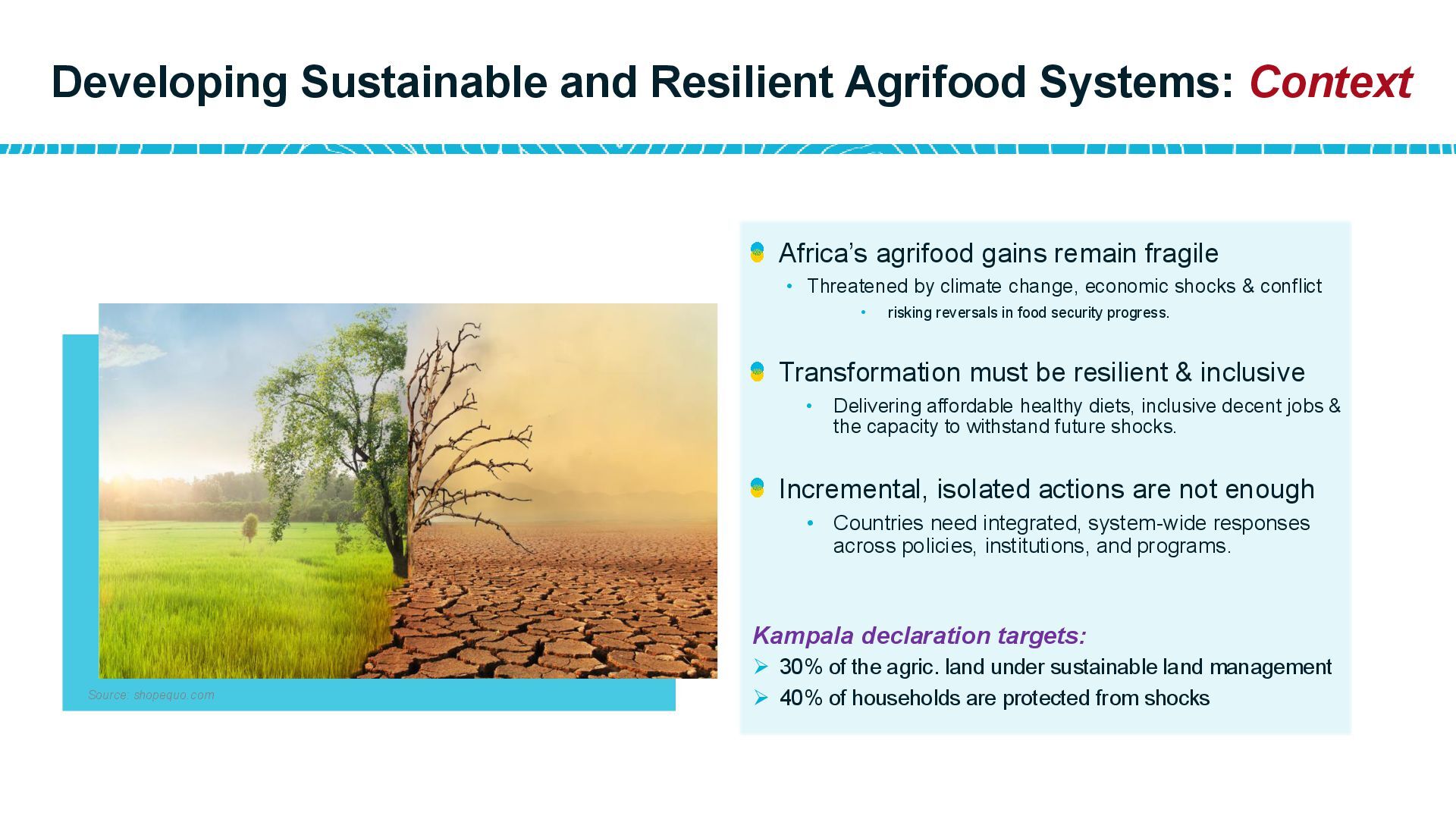 remain fragile • Threatened by climate change, economic shocks & conflict • risking reversals in food security progress. Transformation must be resilient & inclusive • Delivering affordable healthy diets, inclusive decent jobs & the capacity to withstand future shocks. Incremental, isolated actions are not enough • Countries need integrated, system-wide responses across policies, institutions, and programs. Kampala declaration targets: ➢ 30% of the agric. land under sustainable land management ➢ 40% of households are protected from shocks Source: shopequo.com