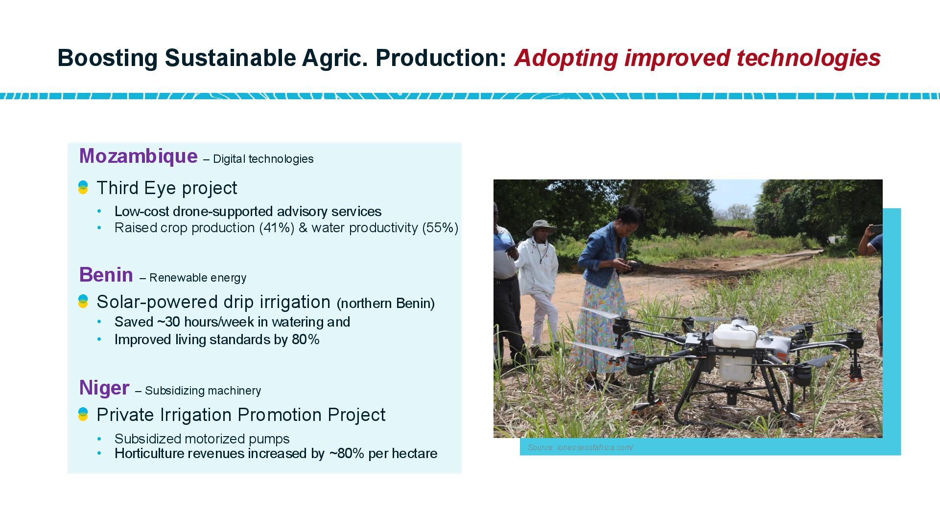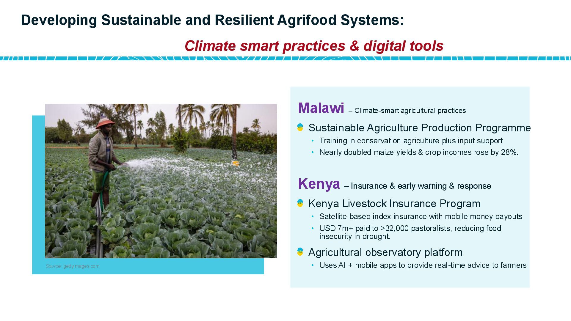 digital tools Malawi – Climate-smart agricultural practices Sustainable Agriculture Production Programme • Training in conservation agriculture plus input support • Nearly doubled maize yields & crop incomes rose by 28%. Kenya – Insurance & early warning & response Kenya Livestock Insurance Program • Satellite-based index insurance with mobile money payouts • USD 7m+ paid to >32,000 pastoralists, reducing food insecurity in drought. Agricultural observatory platform • Uses AI + mobile apps to provide real-time advice to farmers Source: gettyimages.com