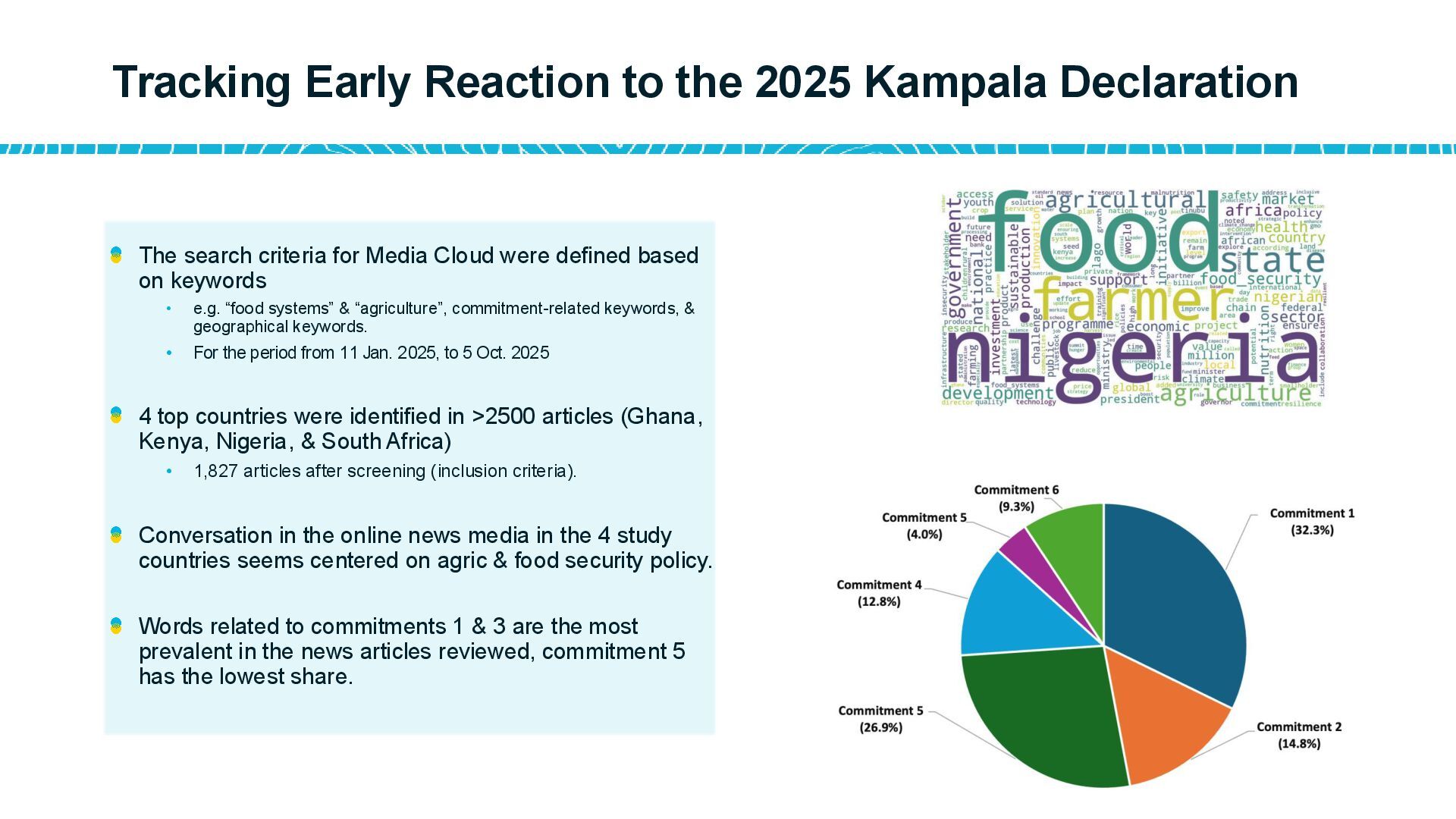 criteria for Media Cloud were defined based on keywords • e.g. “food systems” & “agriculture”, commitment-related keywords, & geographical keywords. • For the period from 11 Jan. 2025, to 5 Oct. 2025 4 top countries were identified in >2500 articles (Ghana, Kenya, Nigeria, & South Africa) • 1,827 articles after screening (inclusion criteria). Conversation in the online news media in the 4 study countries seems centered on agric & food security policy. Words related to commitments 1 & 3 are the most prevalent in the news articles reviewed, commitment 5 has the lowest share.