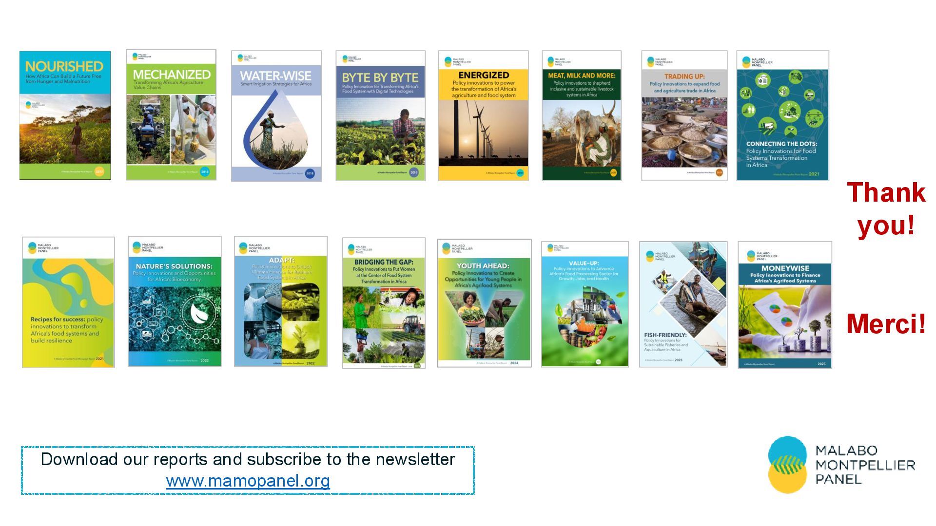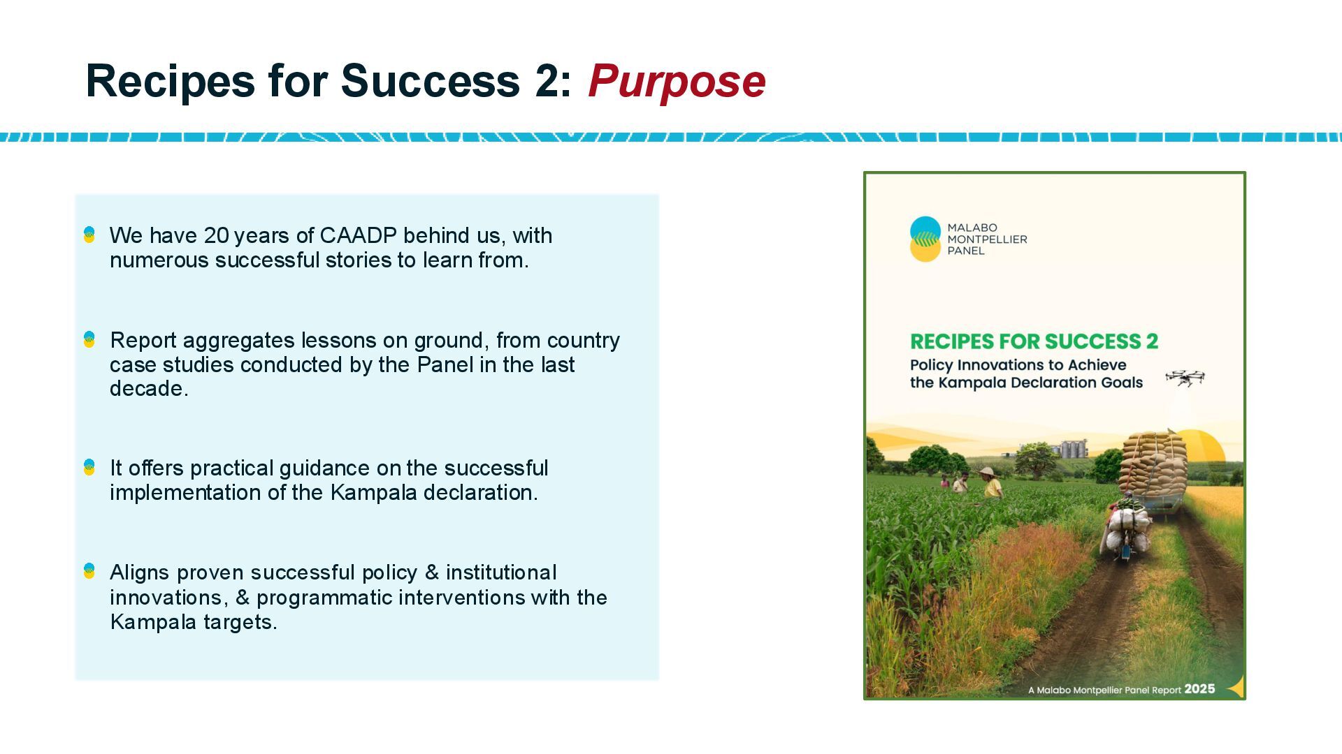 CAADP behind us, with numerous successful stories to learn from. Report aggregates lessons on ground, from country case studies conducted by the Panel in the last decade. It offers practical guidance on the successful implementation of the Kampala declaration. Aligns proven successful policy & institutional innovations, & programmatic interventions with the Kampala targets.